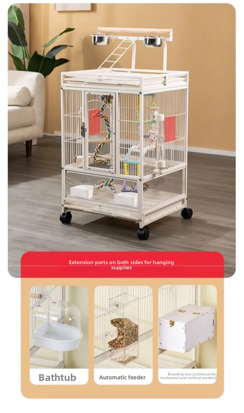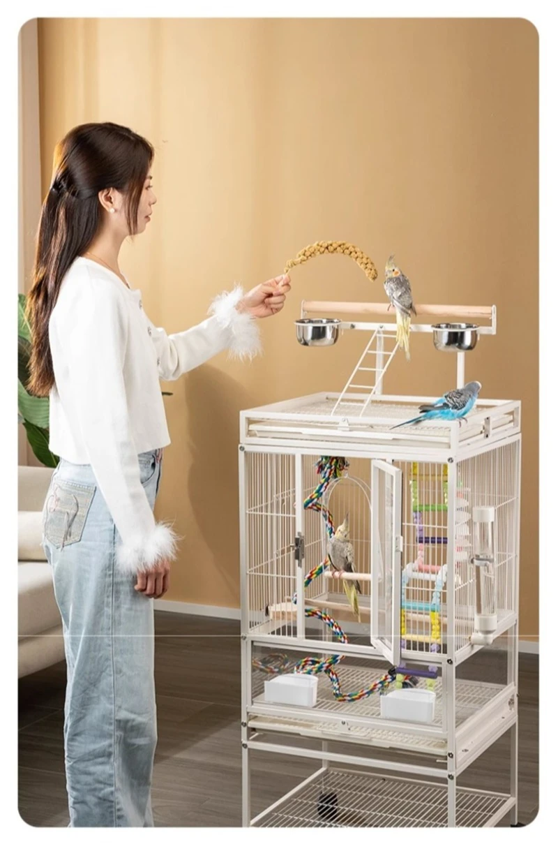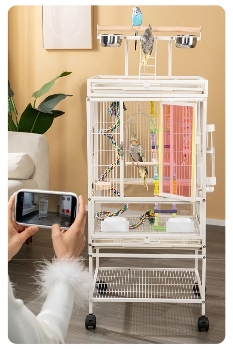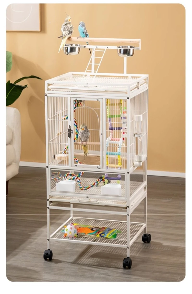 Jaula de Metal para loros y pájaros con ruedas, villas grandes para el hogar, suministros de alimentación multifuncionales fáciles de limpiar, accesorios