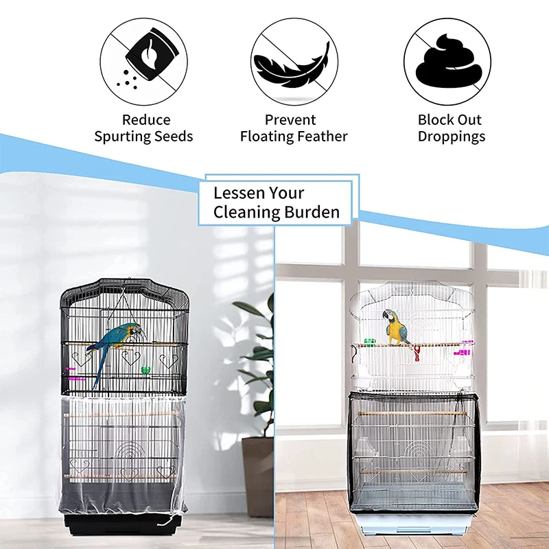 El exclusivo recogedor de semillas de malla de nailon se ajusta de forma segura alrededor de la jaula de su pájaro para ayudar a eliminar la dispersión de semillas en el piso.