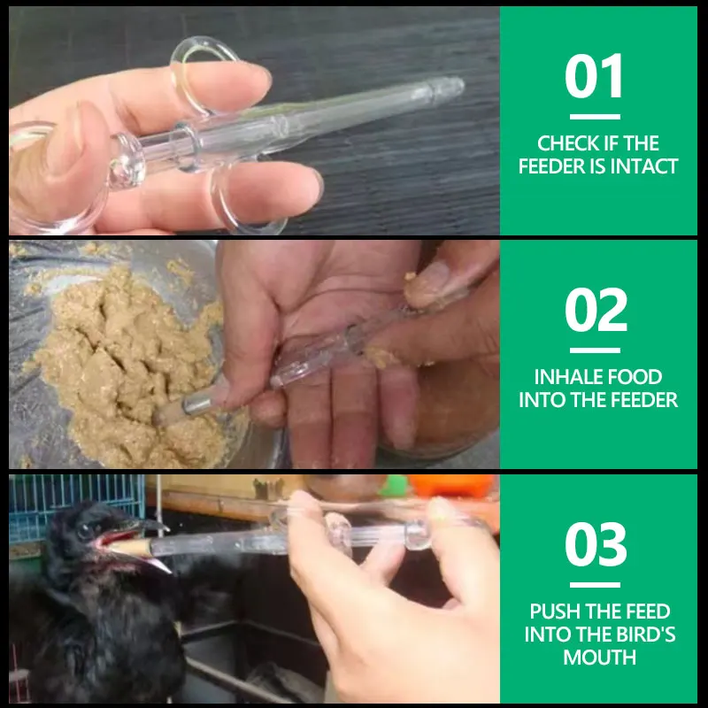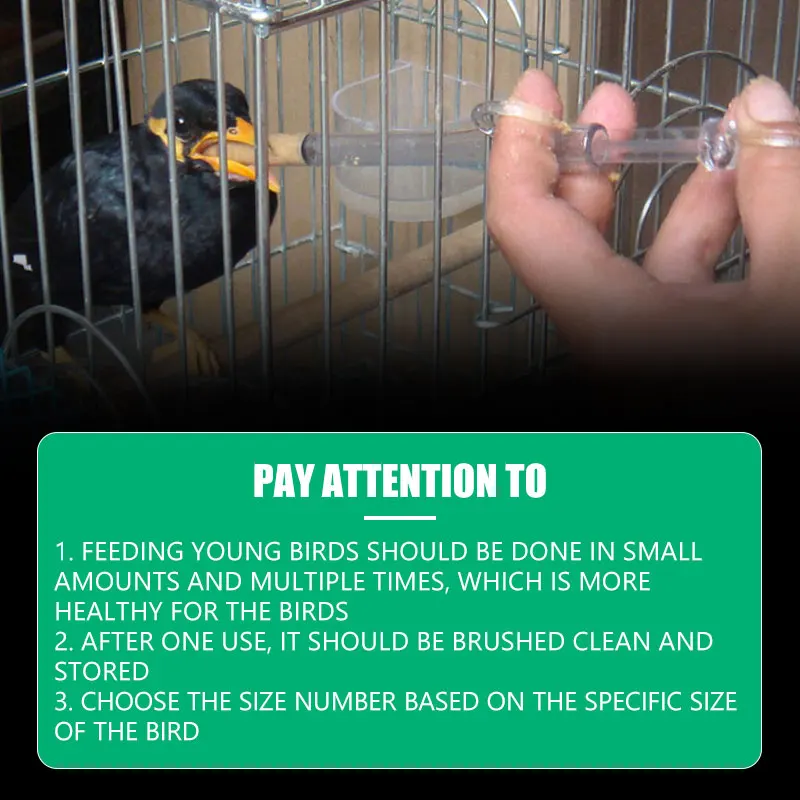 Instrucciones:1. Remoje el alimento con una pasta de agua tibia por adelantado para verificar si el comedero para pájaros está intacto. Inhale el comedero y empuje directamente en la boca del pájaroLas aves están sanas. Empuje el aperitivo directamente en el pico2. Alimente una vez y vuelva a comer cuando tenga 2 horas de edad.3. Cepillar cuando no está en uso puede extender la vida útil.