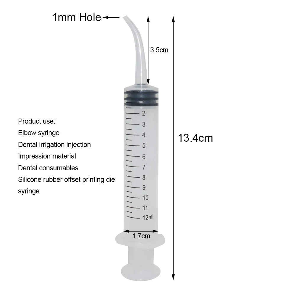 Nombre del producto: Jeringa de codoEspecificación: 12mlMaterial: plásticoUnidad de venta: 5/4/3/2/1 piezaUso del producto: equipo de laboratorio de enseñanza, herramientas dentales, alimentador de alimentos líquidos, etc.Longitud de la cabeza del codo: 3,5 cmCalibre de la aguja: 1 mmDiámetro del tubo de la jeringa: 1,7 cm