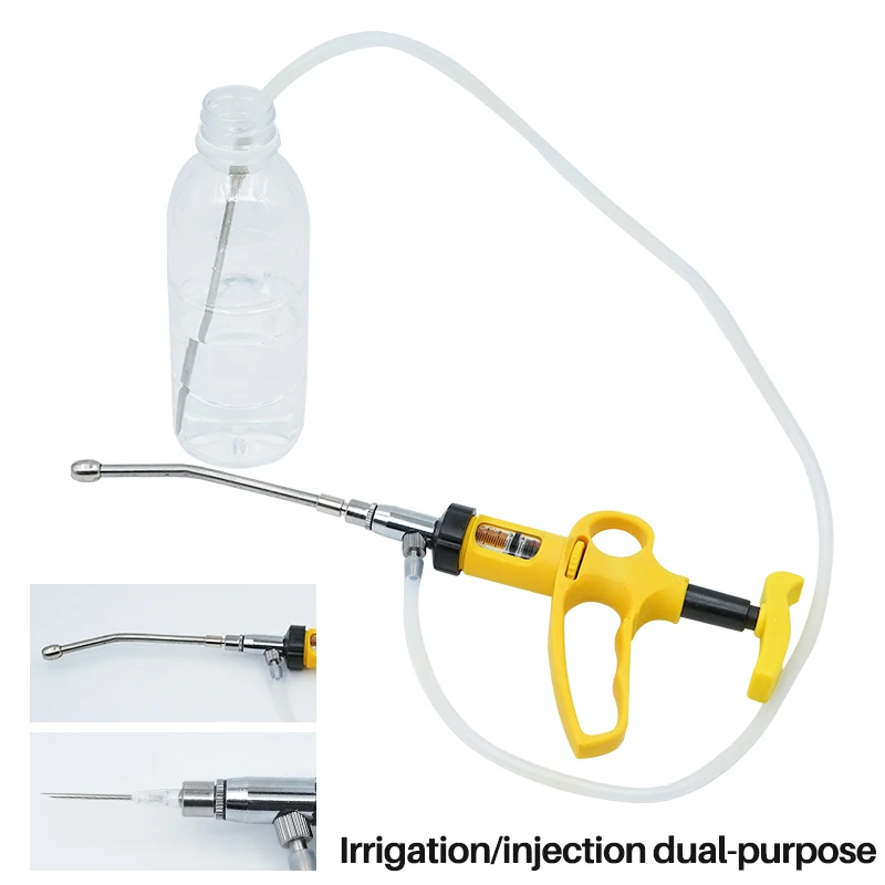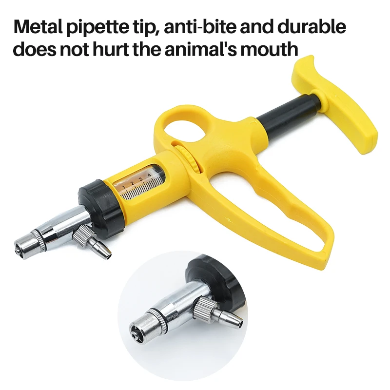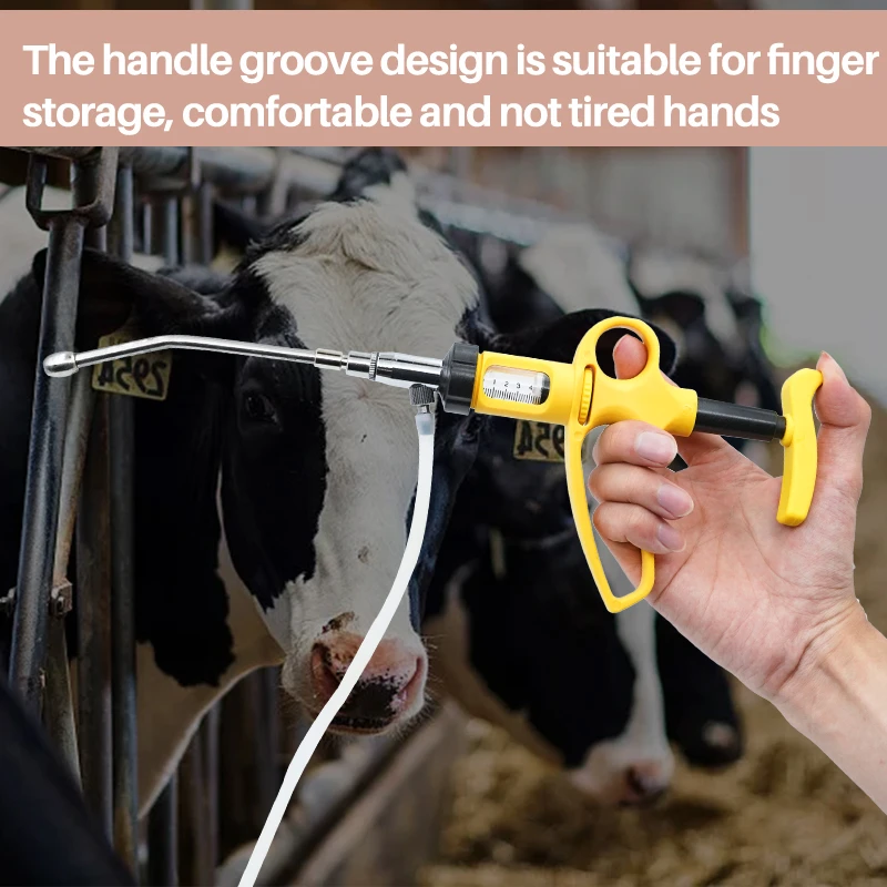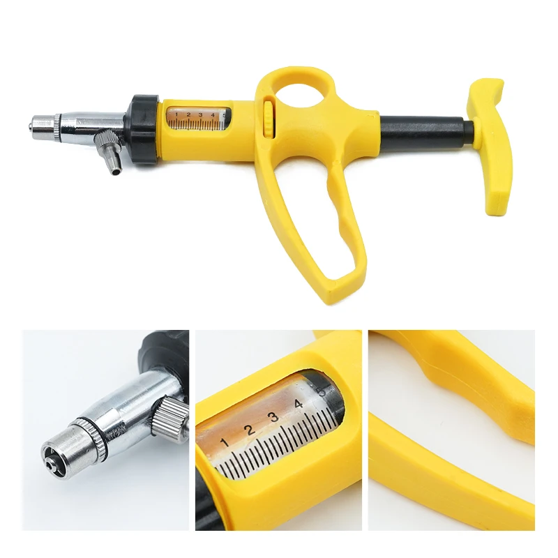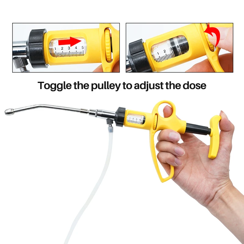 Product Features:1.Easy to use g un suitable for all drench types both oral and pour on.2.Rotary adjustment switch function.3.Infinitely adjustable dose from 0.5ml to 5ml.4.Unbreakable barrel for long life.Directions for use:1. Fill the sink or tub with soapy water (warm water).2. Turn the knob to separate the syringe tube from the handle and soak both in soapy water.3. Soak for 5-6 minutes.4. Remove the syringe tube and handle, reassemble them and restore them to their original state.5. The syringe inlet is immersed in water, and the water is pumped several times.6. Empty the sink or tub of soapy water, wash it off, and refill it with clean water.7. Immerse the inlet of the syringe in clean water, repeatedly flush the residue with water until it is clean, and then cool dry for reuse.8. After use for a period of time, if the piston is stiff, turn the knob, remove the injection tube, and smear the piston ring with olive oil or edible oil for lubrication.After the use of live vaccine, syringes should be disinfected, and non-irritating and non-corrosive chemical disinfectant can be used before cleaning to soak and disinfect, and then clean.