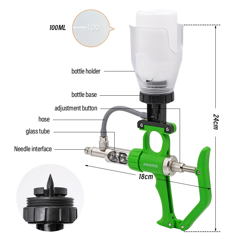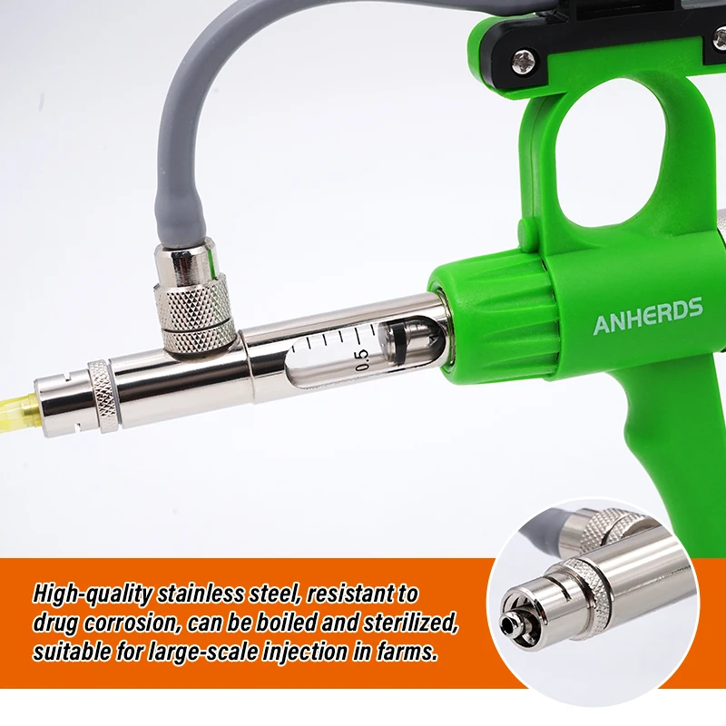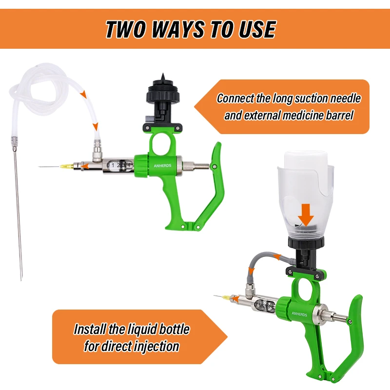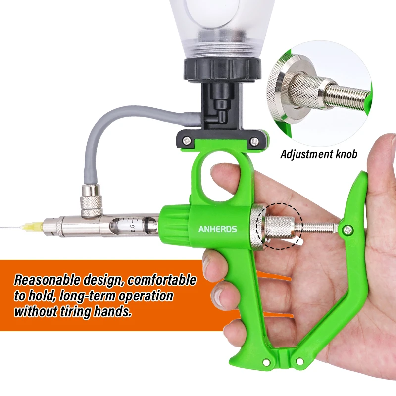 Descripción del producto: Inyección continua, ajustable, se puede fijar, ahorra mano de obra 20%-30%, ahorra tiempo y esfuerzo, accesorios incorporados, inyección más precisa, accesorios completos, con piezas de repuesto, prolonga la vida útil Cuerpo principal de acero inoxidable Uso: 1. Use la botella autónoma 2. Conecte el tubo de silicona para tomar el medicamento 3. Inserte directamente el frasco pequeño de la vacuna Nota: Después de su uso, relaje la cubierta y el ajuste del pistón y lávelo limpio.