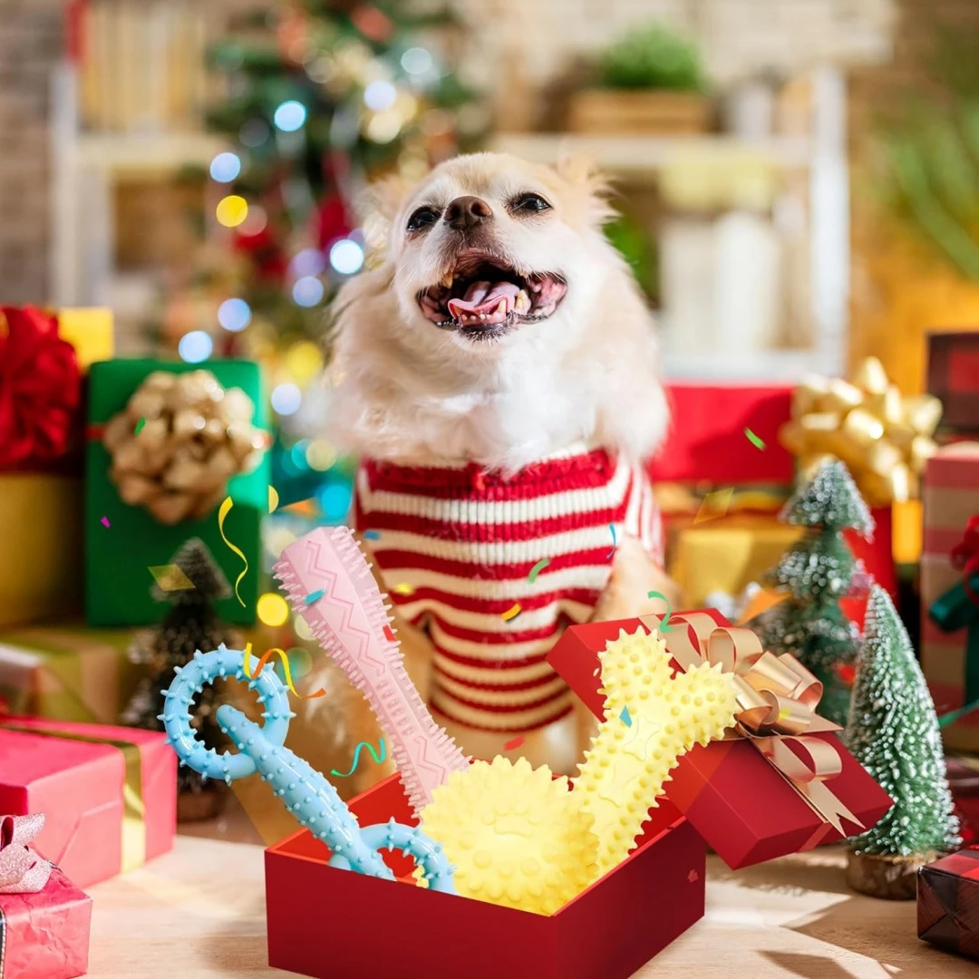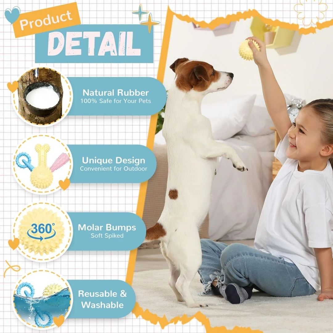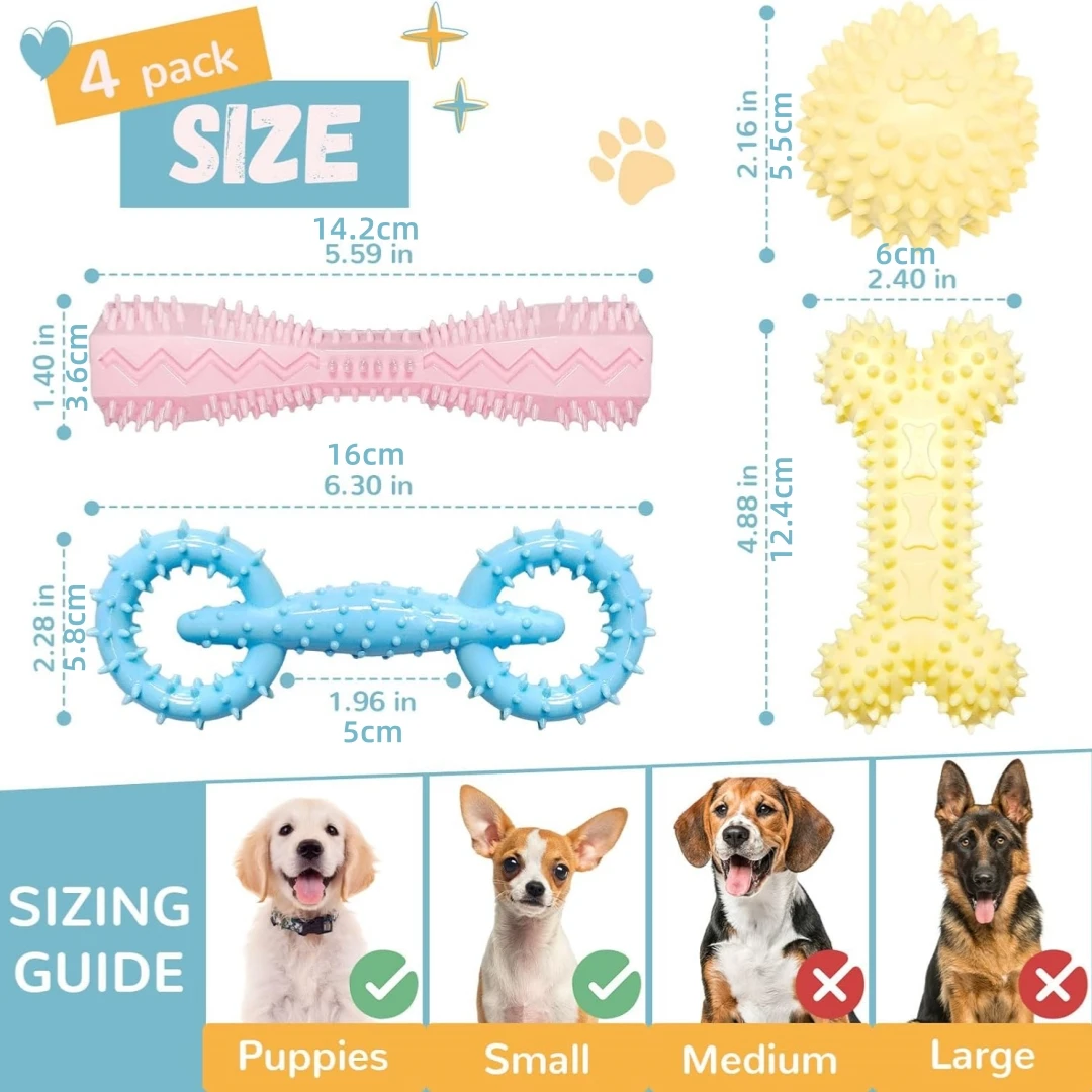Juego de 4 piezas de juguetes para masticar para cachorros, adecuado para 2-8 meses, dentición suave, juguetes para cachorros para limpiar los dientes, bola de goma, hueso, donas, inter