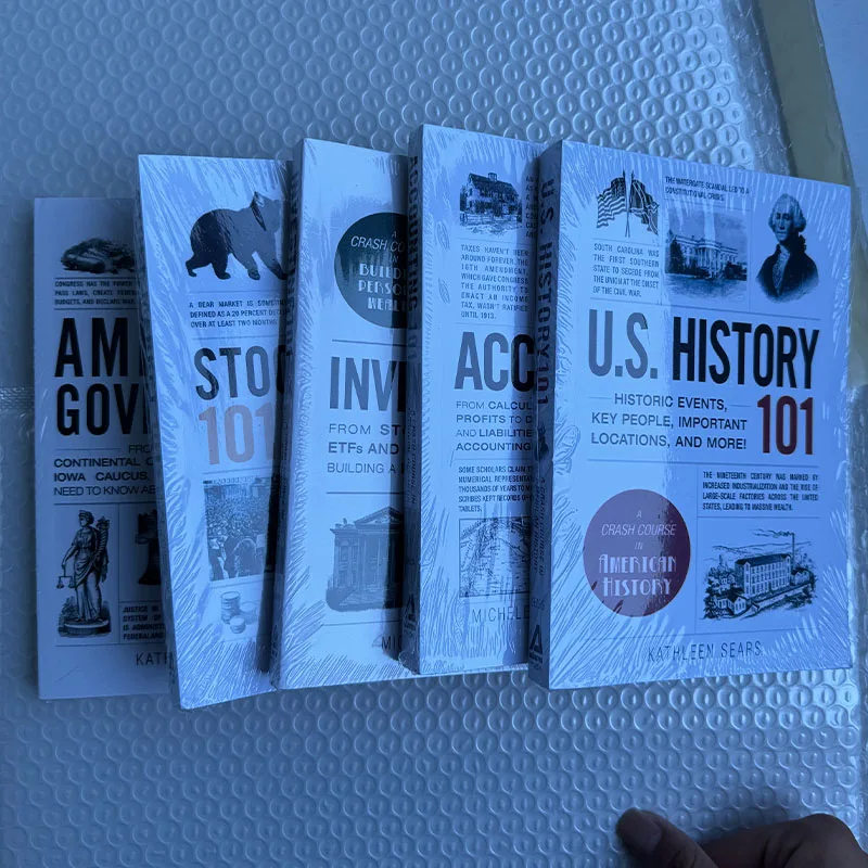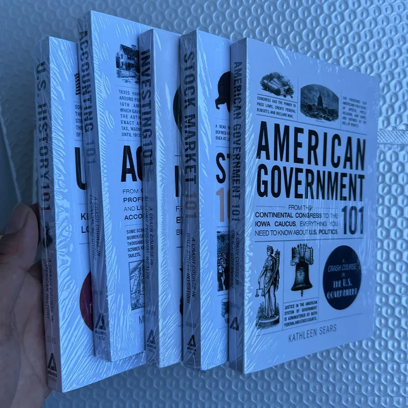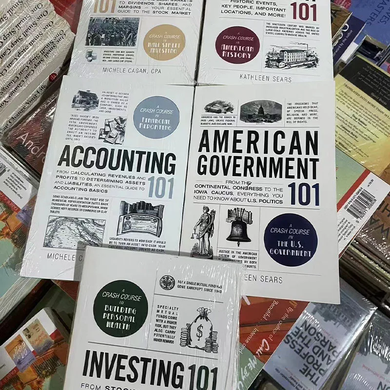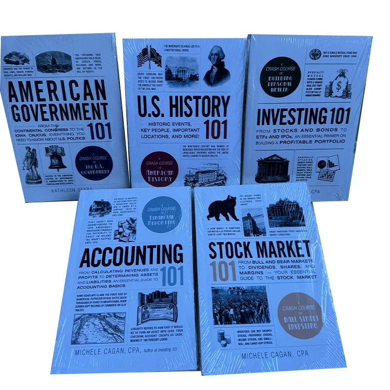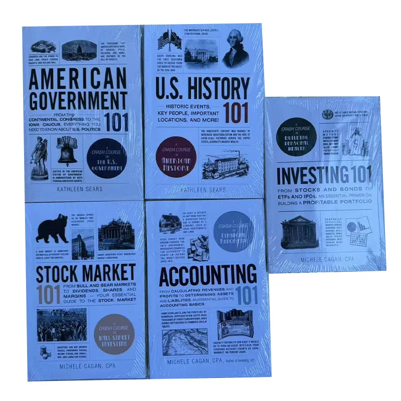Juego de 5 libros en inglés, libro de la serie 101 del pueblo americano, historia de los Estados Unidos, mercado de existencias, contabilidad, libros de inversión
