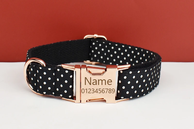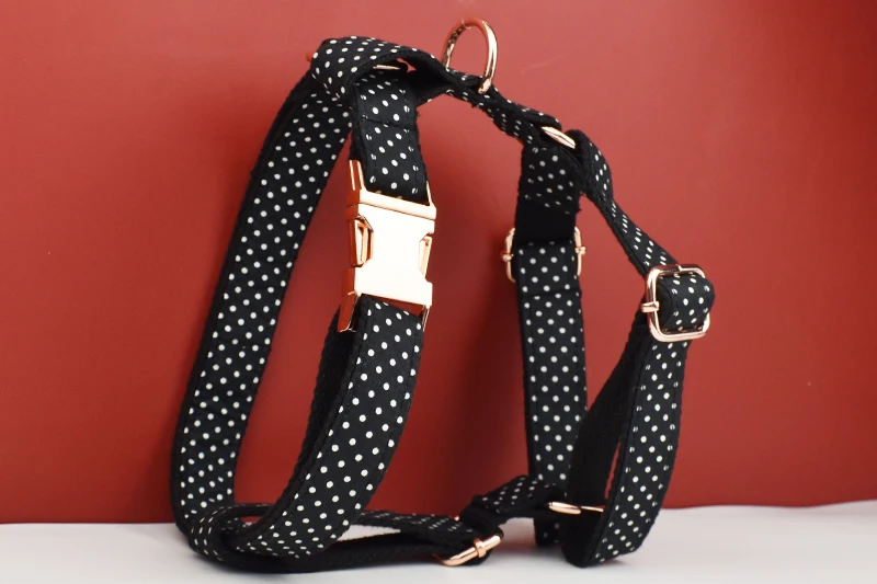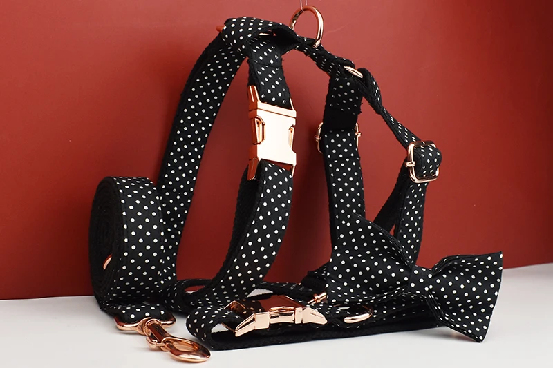 Diseño personalizado de alta calidad Logo punto negro Denim algodón suave accesorios para mascotas Collar de perro personalizado correas arnés arco conjunto Zzkdot 02