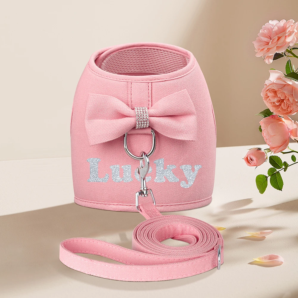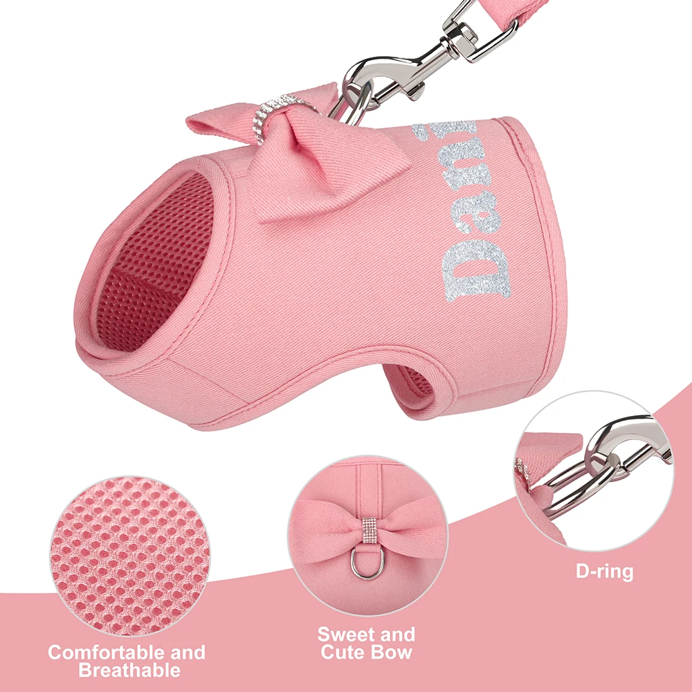 Conjunto de arnés y correa personalizados para perros, chaleco con nombre impreso gratis, arnés con pajarita bonita para perros pequeños y medianos, gatos, Pug