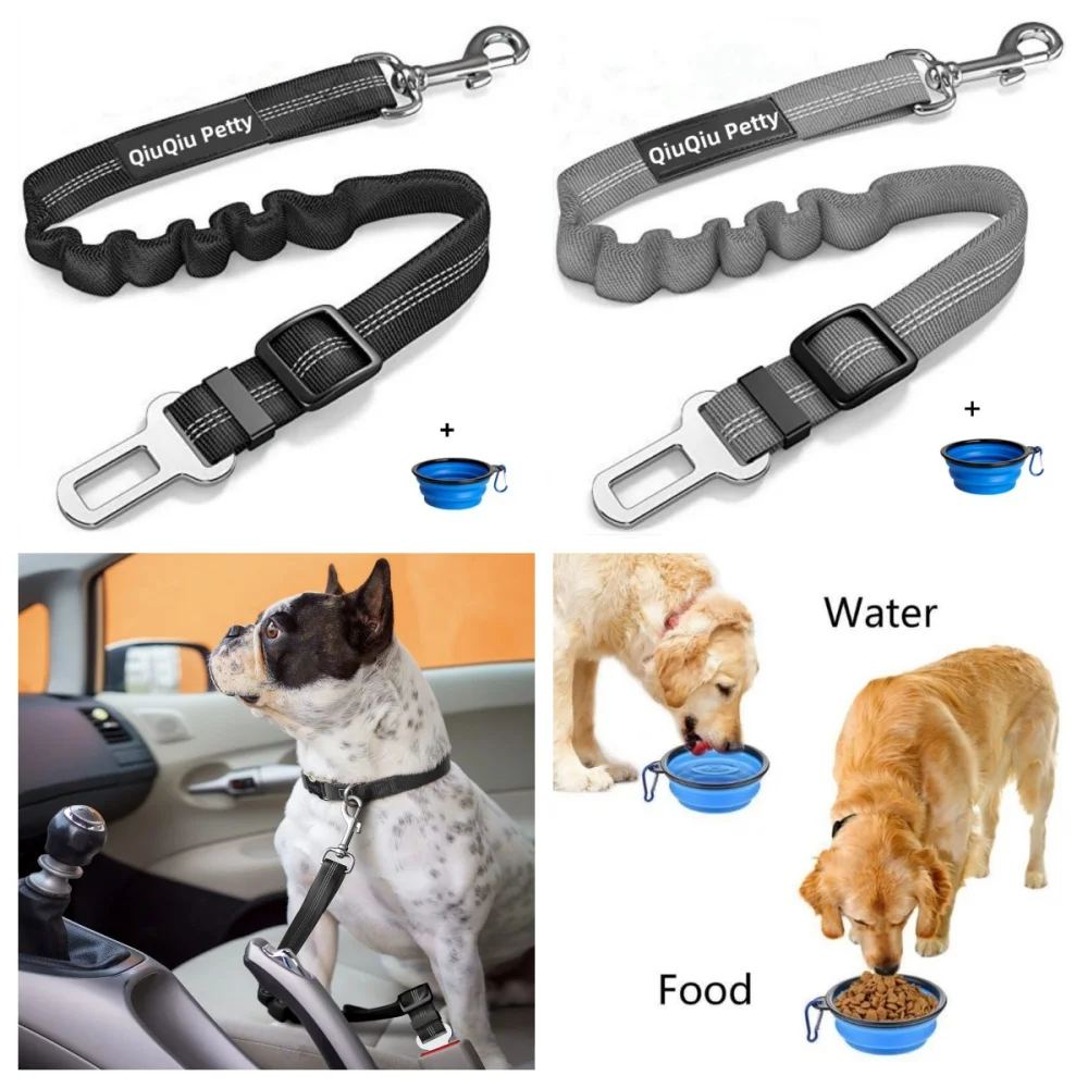Juego de arnés retráctil para coche para perros con cinturón de seguridad ajustable, correa de seguridad de nailon para mascotas, arnés para coche para perros, con cuenco plegable para mascotas