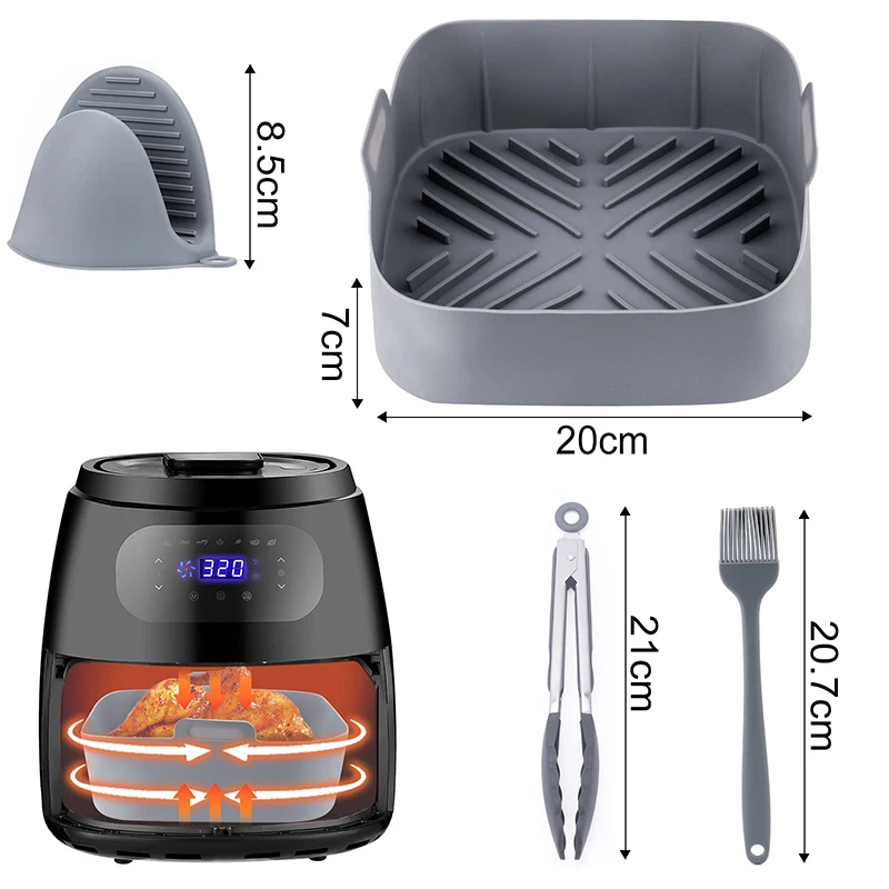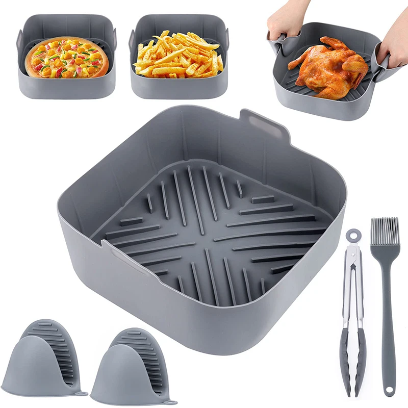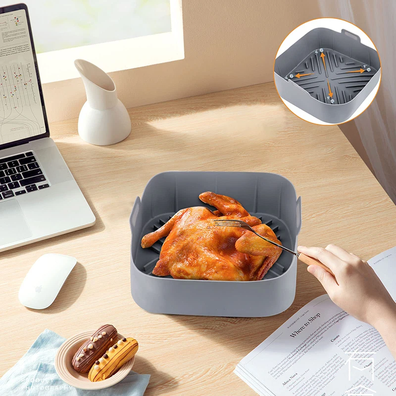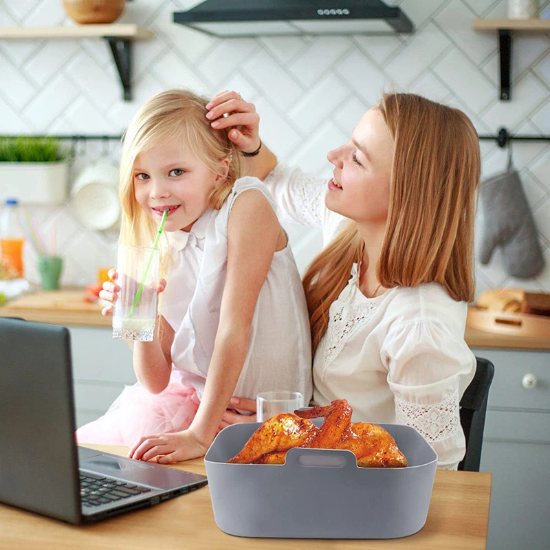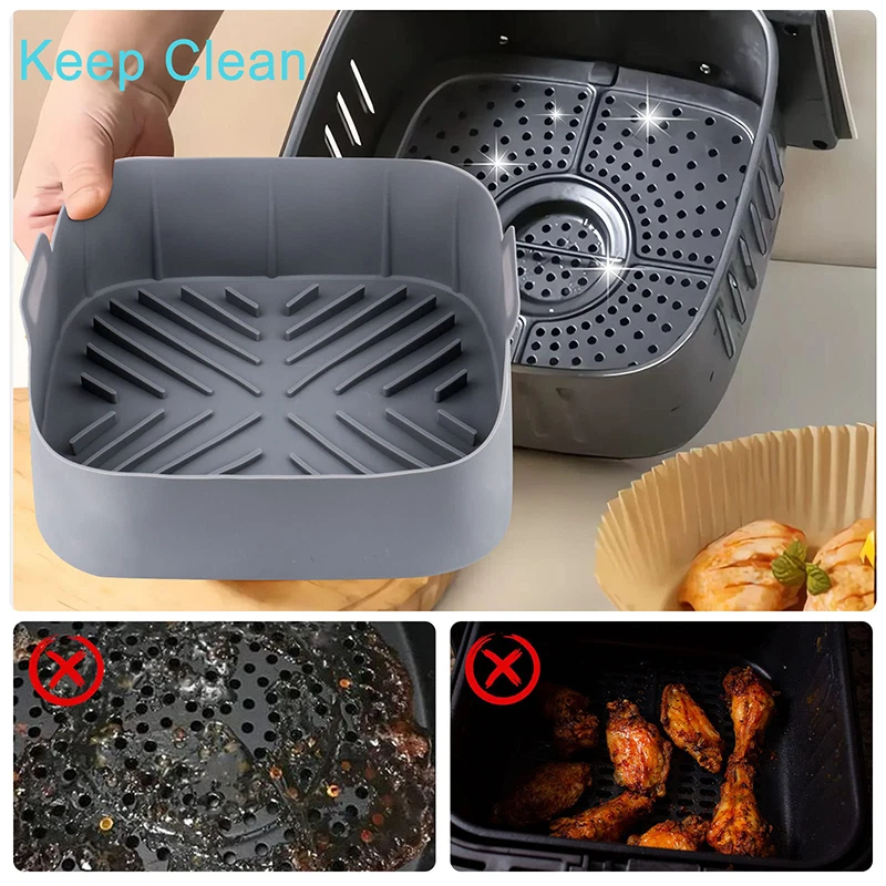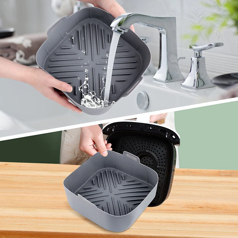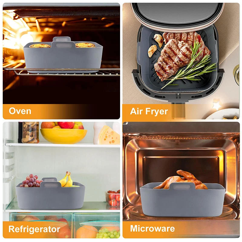 [Multifuncional] El molde de la freidora está hecho de material de silicona grueso de alta calidad y se puede utilizar para hornear, freír, freír o servir alimentos.Es adecuado para freidoras, microondas, latas, utensilios de cocina, vapor y hornos, y es perfecto para el hogar/exterior, hornear, acampar y reuniones.