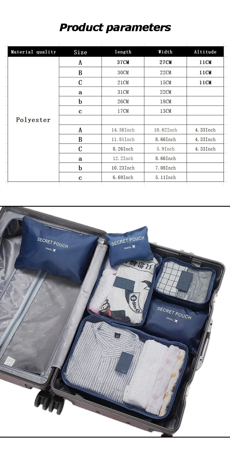 1.Bolsa de 6 tamaños diferentes para ropa, zapatos, cepillos de dientes y maquillaje.Antitarme, buena permeabilidad. La maleta para guardar equipaje tiene un diseño perforado que permite una buena ventilación y mantiene la ropa con un olor limpio y fresco.