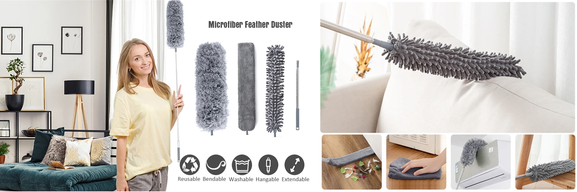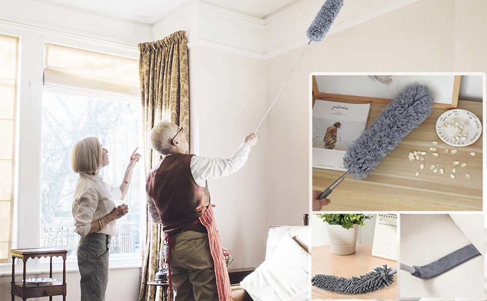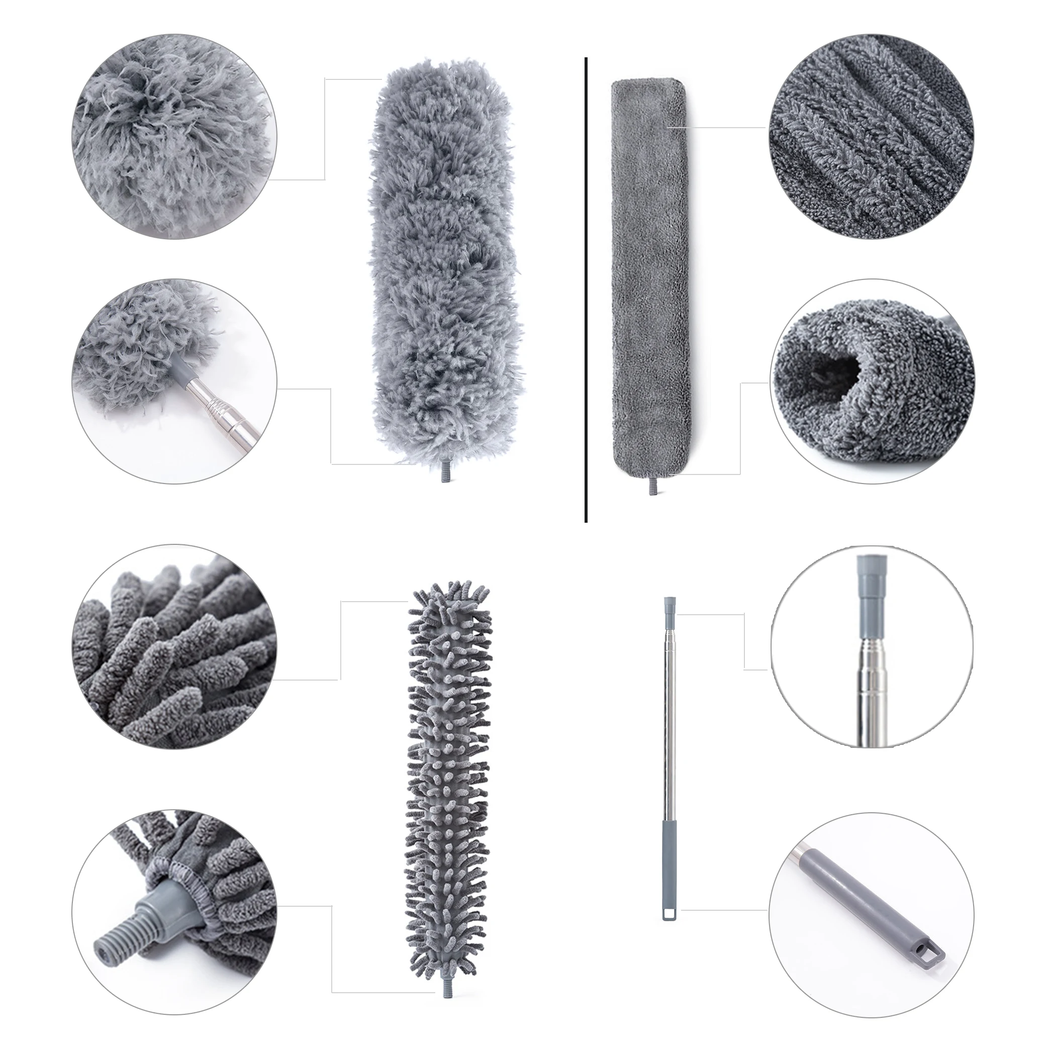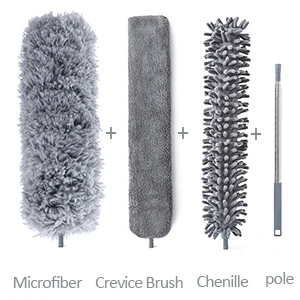 Punto de venta: Plumero de microfibra: atrae polvo, polen y pelos con facilidad, no flotará por todas partes. Plumero de chenilla flexible: el plumero flexible y flexible se puede usar en las aspas del ventilador de cualquier forma. Se puede doblar y mantener en la forma requerida para maximizar el área de la superficie de eliminación de polvo y la absorción de partículas de polvo. Cepillo para grietas: plumero de limpieza para la parte inferior de los muebles del sofá cama, fácil de limpiar. Especificación Tamaño reducido: 74x8cm Tamaño estirado: 250x8cm Peso: 0,35 kg Material: chenilla + acero inoxidable + PP + esponja Contenido del paquete: 1 mango largo de acero inoxidable 2,5 M (Extensible) 1 plumero de microfibra 1 * cepillo para grietas 1 Cepillo de chenilla