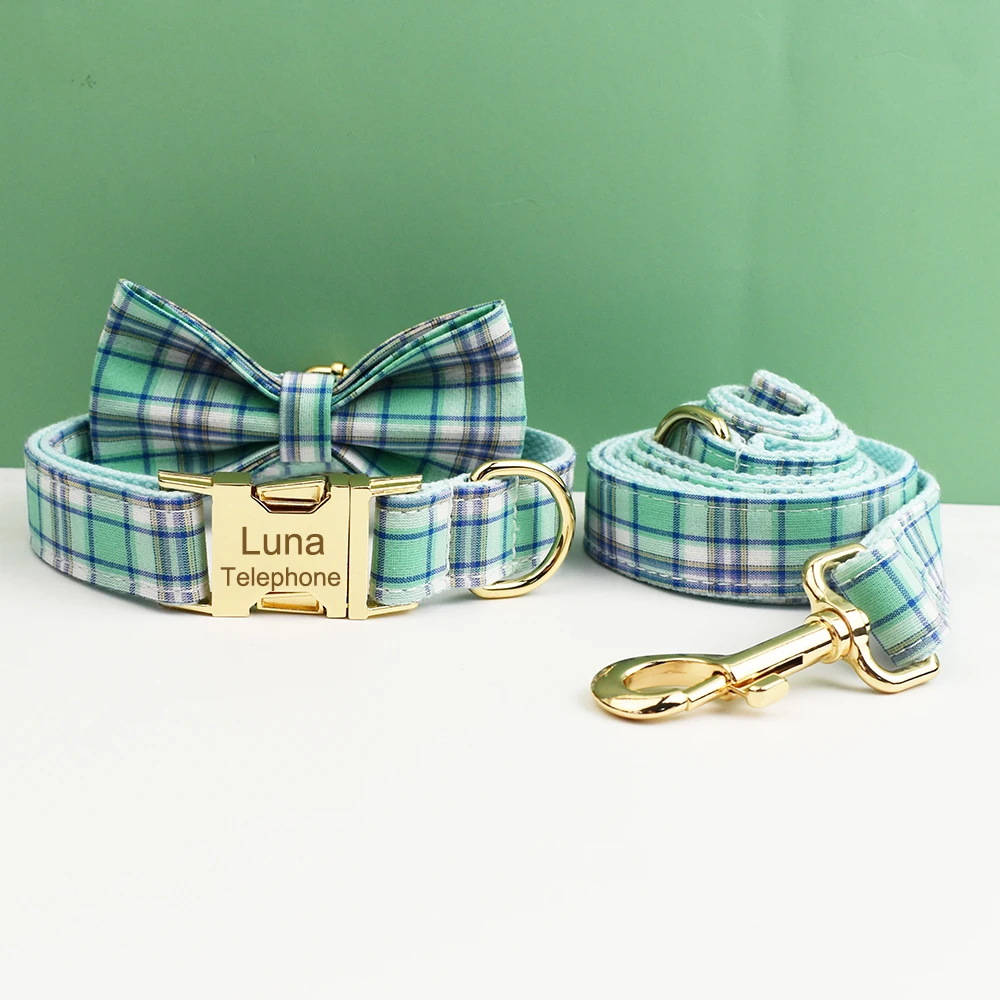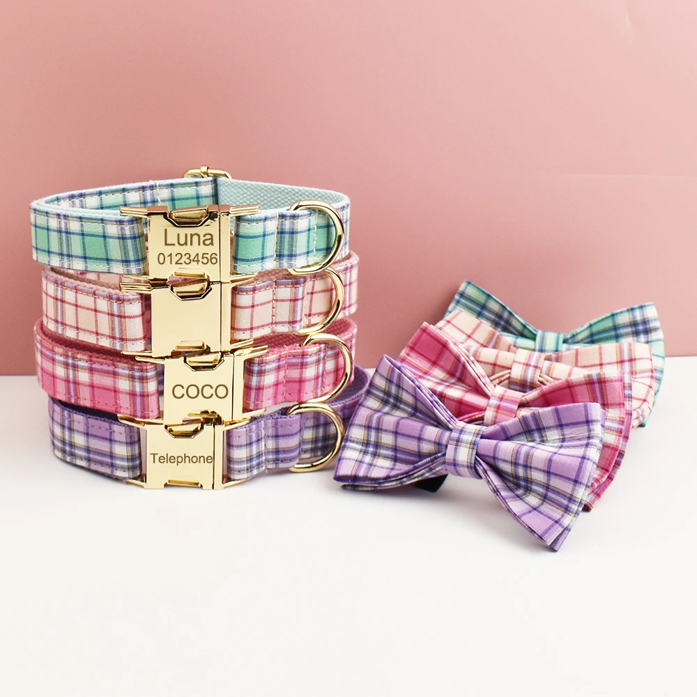 Juego de collar y correa para perro a cuadros grabados personalizados, suministros para mascotas con placa de identificación, correa para perro con rejilla para perros