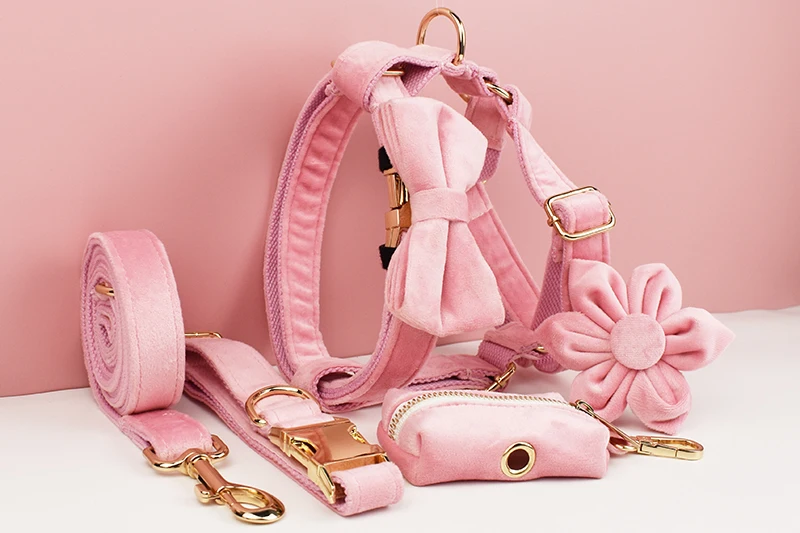 Collar y correa de terciopelo rosa para perros pequeños, medianos y grandes, placa de identificación grabada personalizada, suministros para mascotas, correa para perros Velvet 01