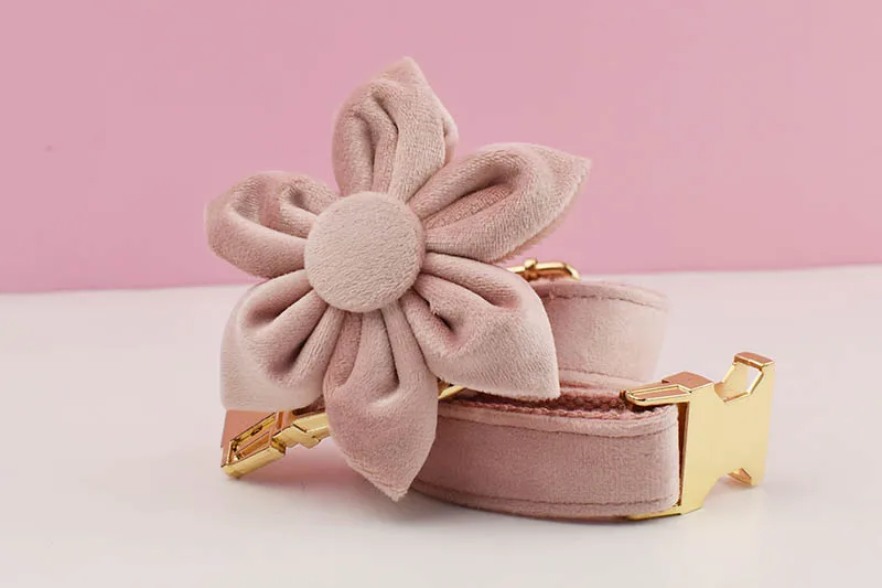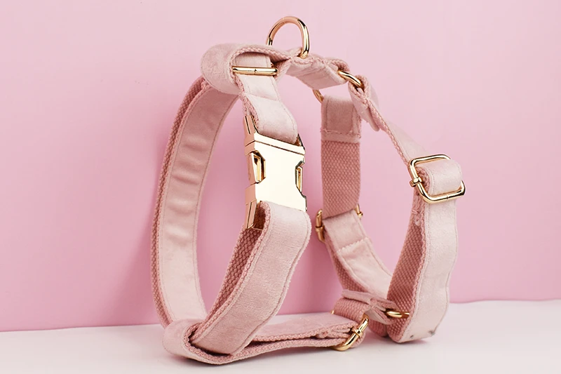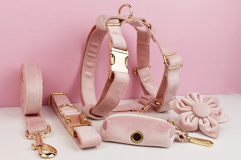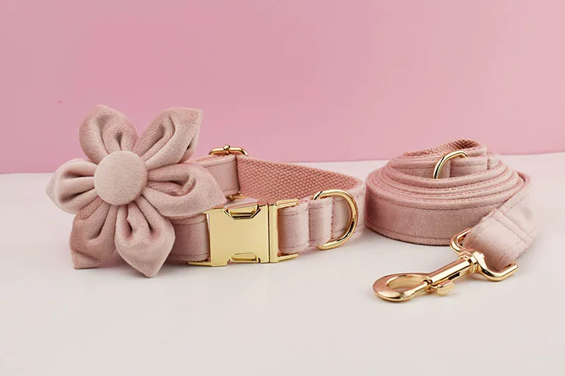 Juego de collar y correa de perro de terciopelo rosa pálido para perros placa de identificación grabada personalizada suministros para mascotas correa de perro Velvet36