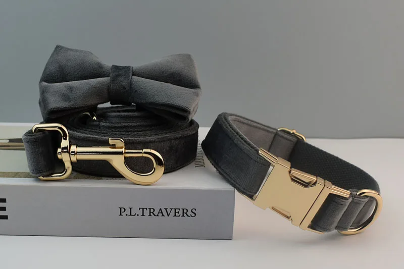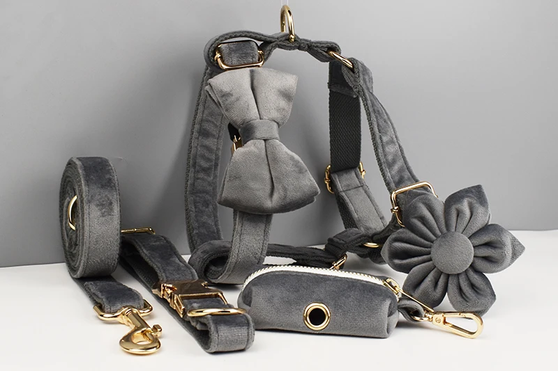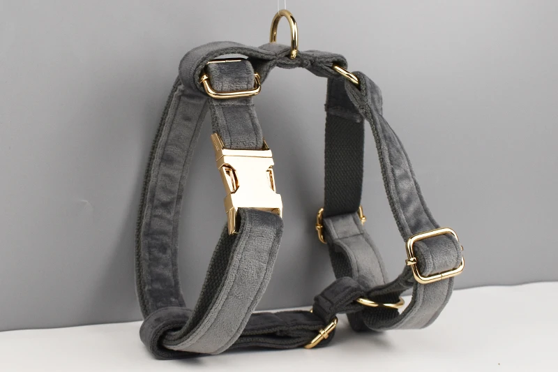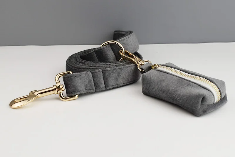 Conjunto de collar y correa de perro de terciopelo gris oscuro para perros Placa de identificación grabada personalizada Suministros para mascotas Correa de perro Velvet31
