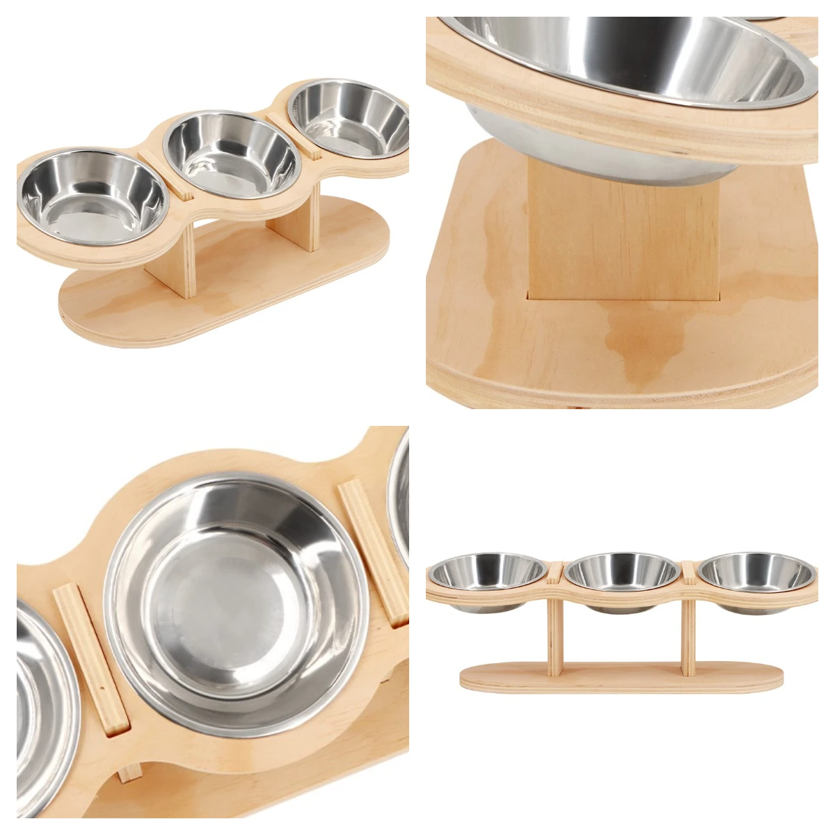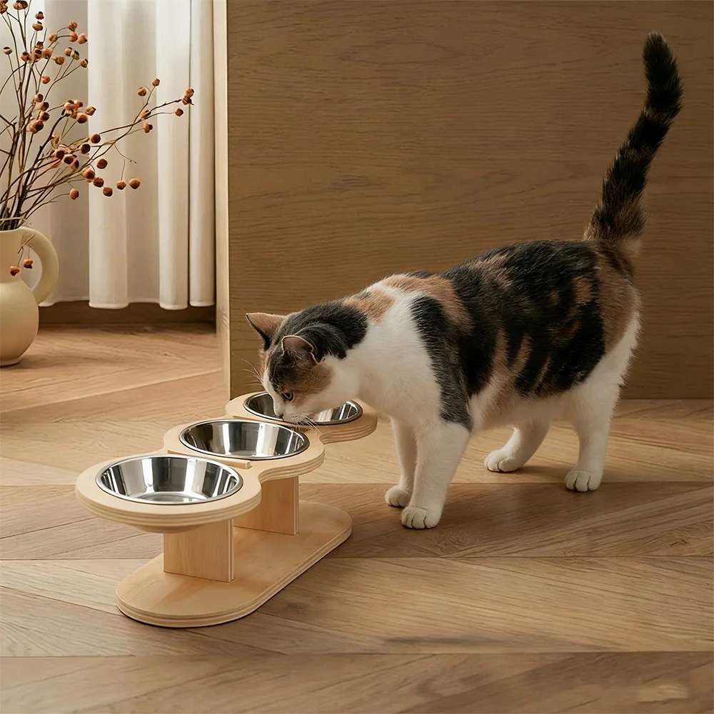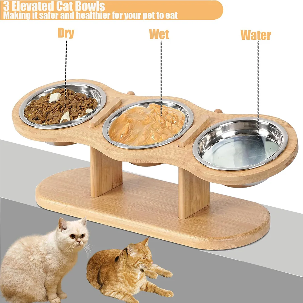 Juego de cuencos elevados para comida y agua para gatos con base de madera, 3 tazones de acero inoxidable para alimentos secos/húmedos y comedero elevado para mascotas