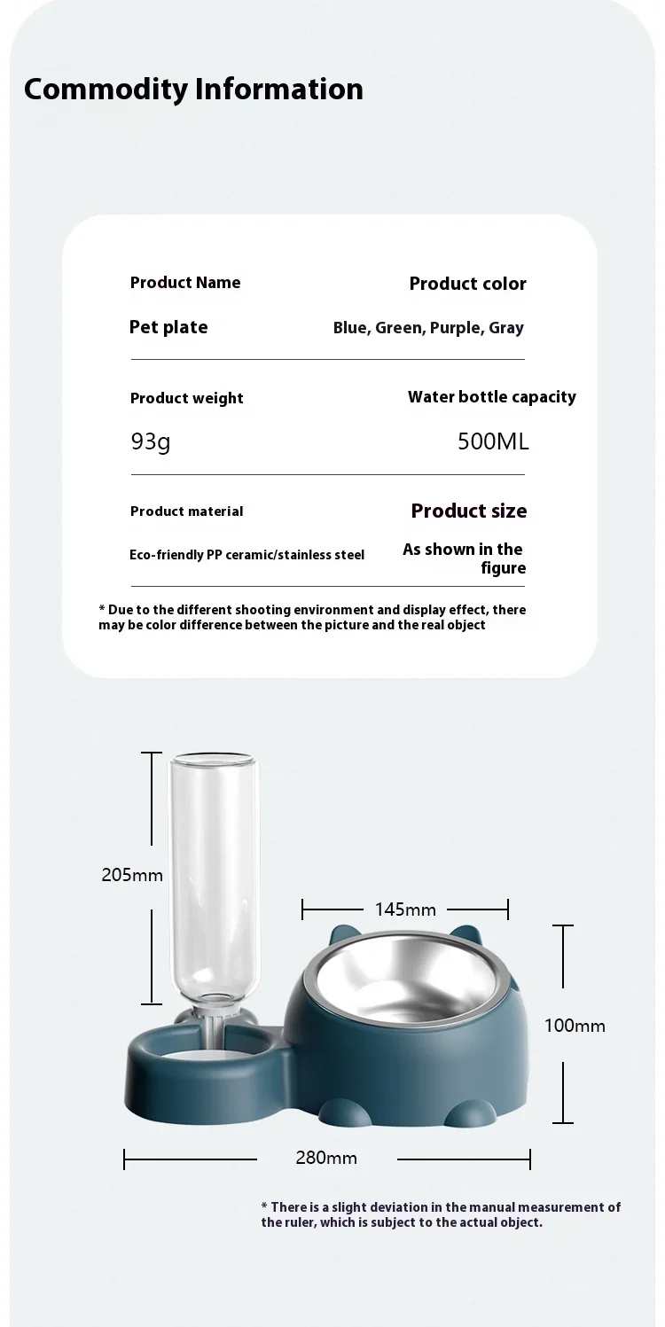 - Botella de agua reemplazable: nuestra botella de agua para tazón de agua es reemplazable, adecuada para cualquier botella para beber con un diámetro de 28 mm en el mercado.El recipiente para comida mide 14 cm * 4 cm y la capacidad de la botella de agua es de 500 ml.