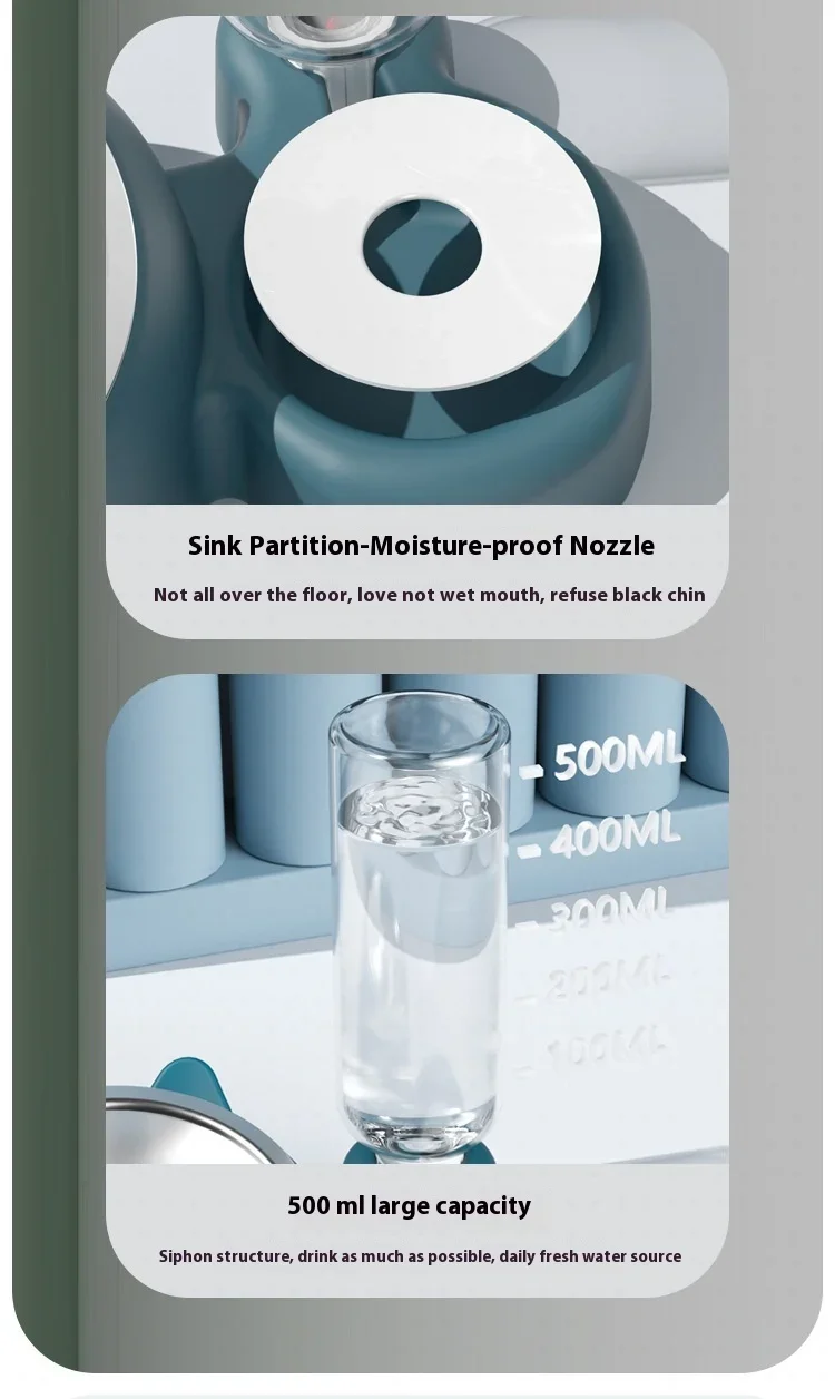 - Cuenco de agua con deflector: el diseño del deflector de hilo dental evita que grandes áreas de agua mojen los pelos de la boca de la mascota.Mantenga el pelo de su mascota seco y teñido.A prueba de polvo y cabello, más seguro e higiénico.