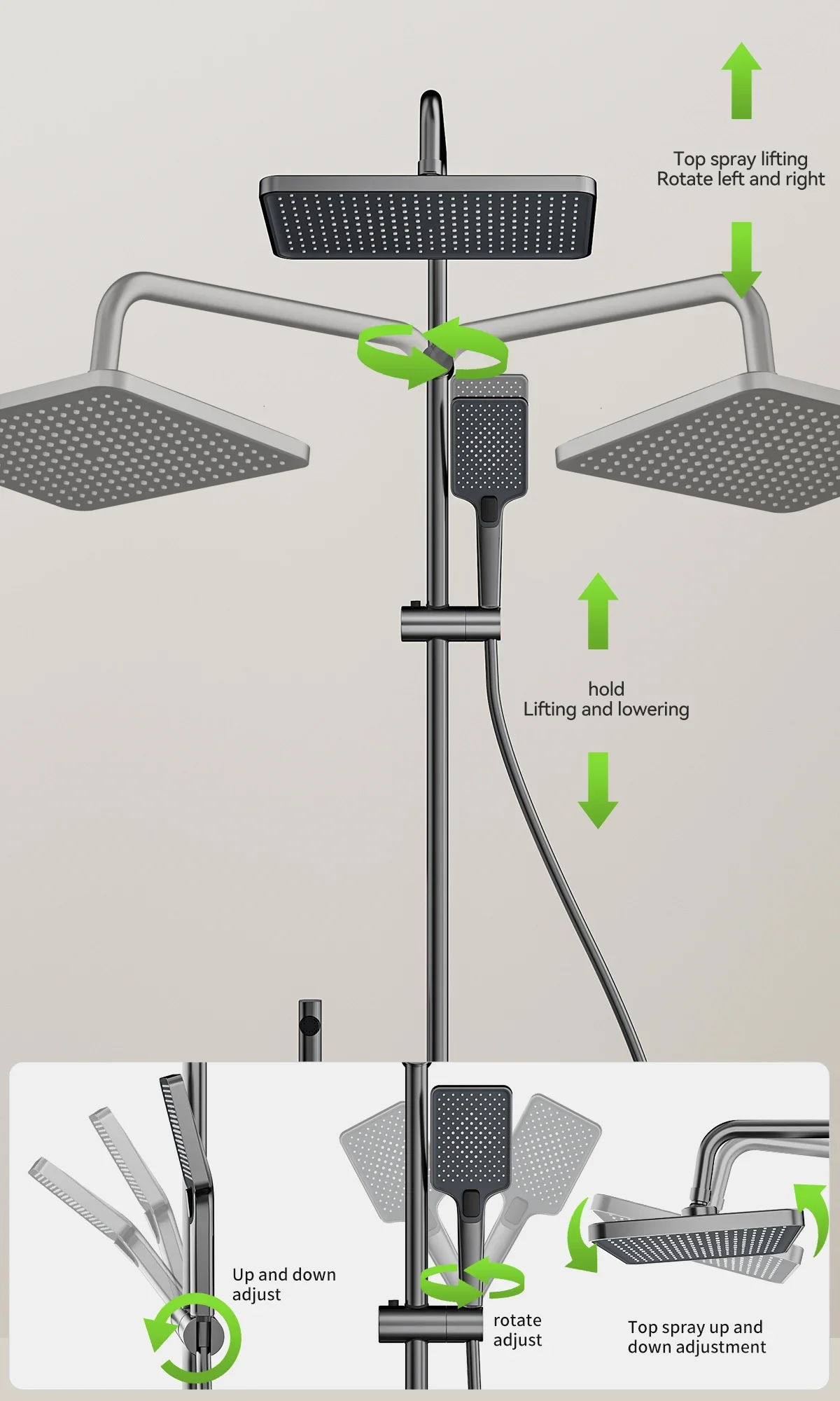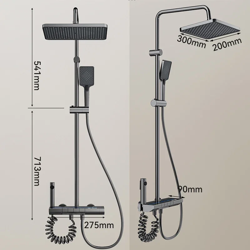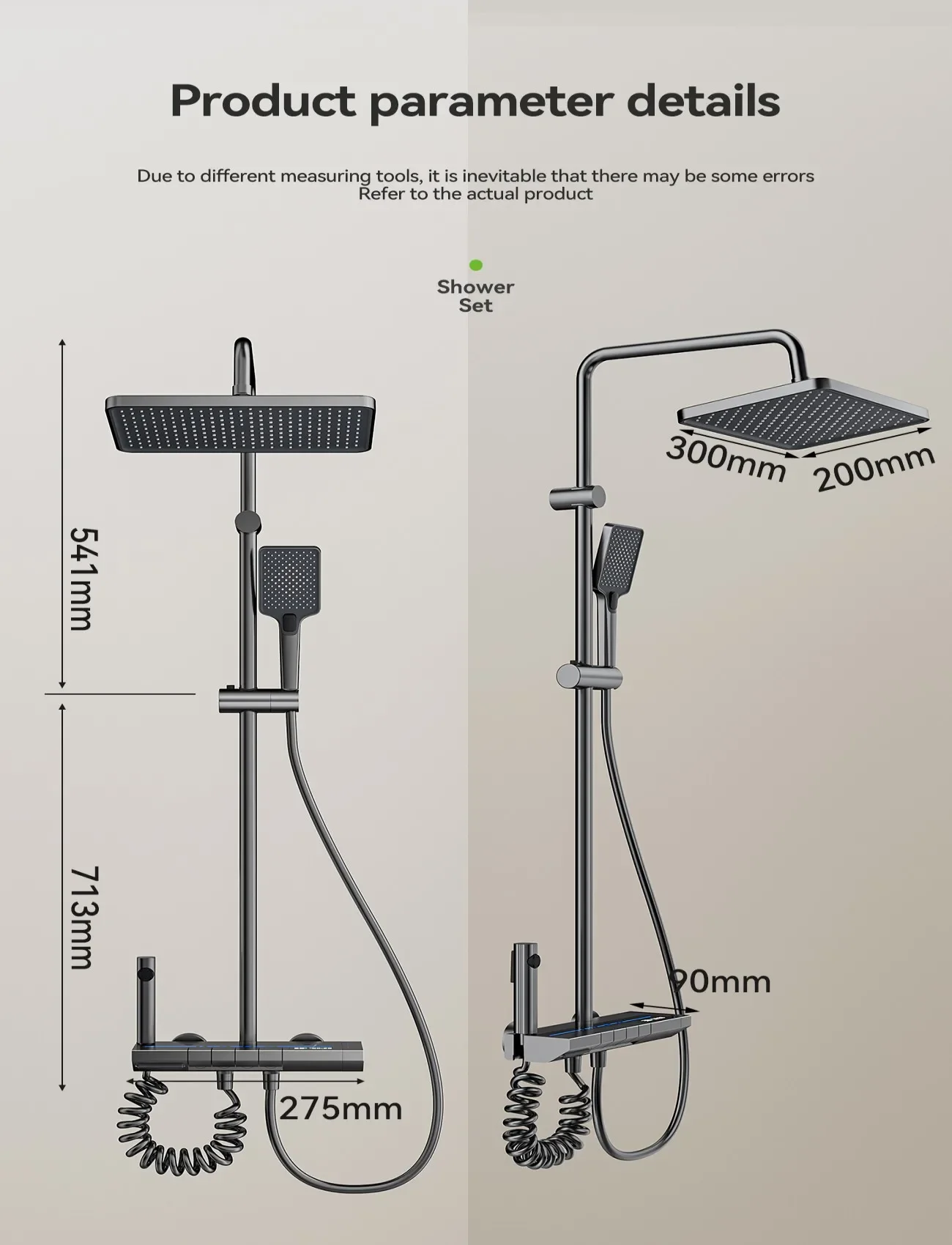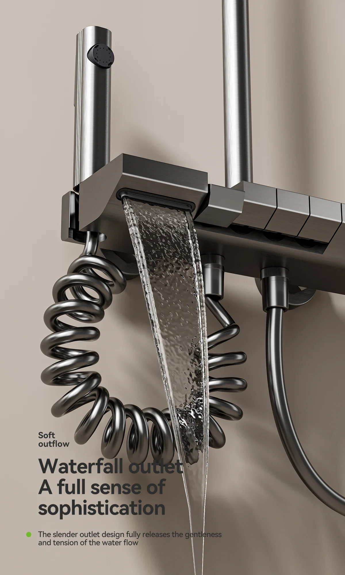 ¡Presentamos nuestro juego de ducha espacial de aluminio de aviación de primera línea! Este Sistema de ducha de lujo es imprescindible para su baño. Nuestro producto cuenta con una bañera de lluvia LED con pantalla digital, grifos de baño con luz de lluvia de piano fría y caliente y todo lo que necesita para una experiencia de ducha lujosa.