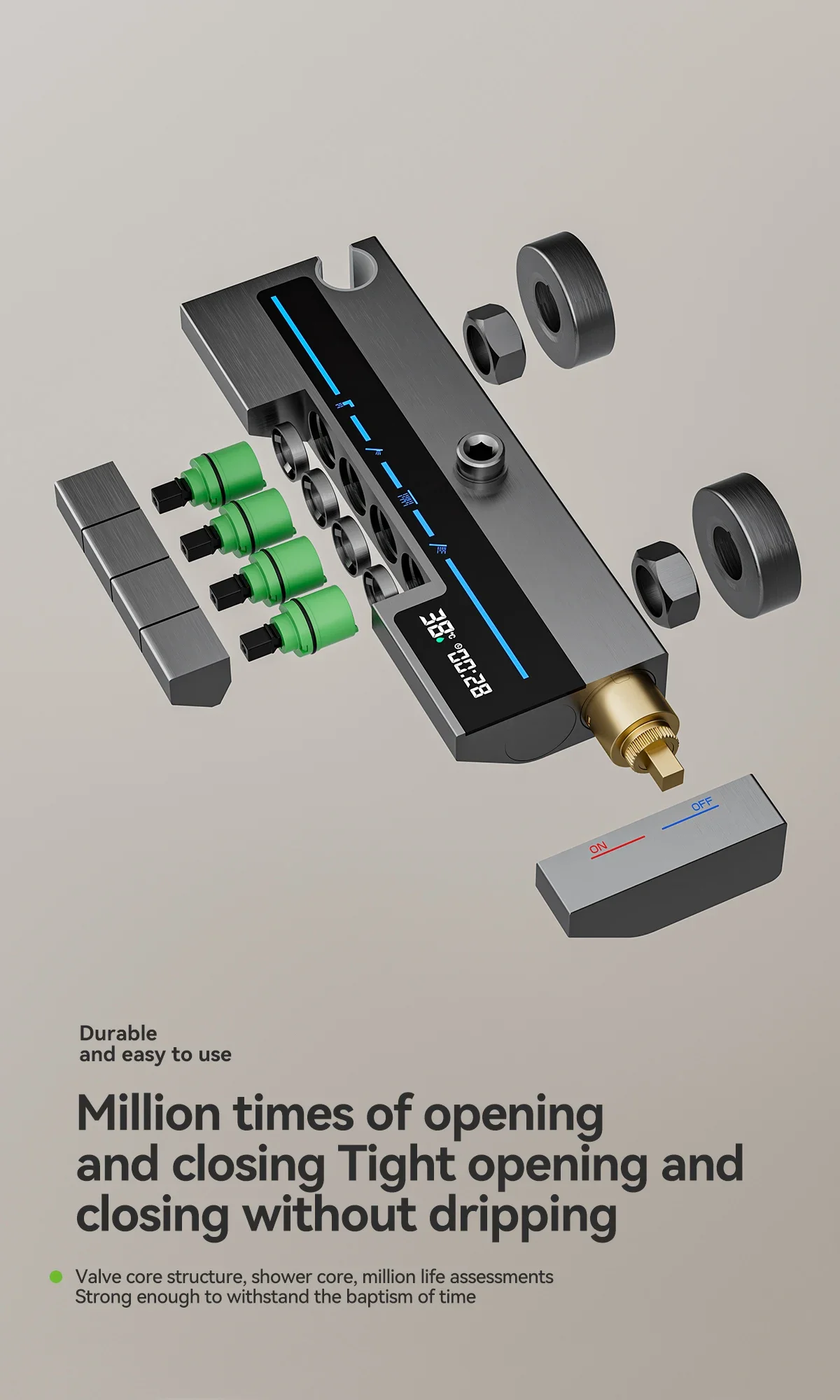 El material de aluminio de aviación de alta calidad garantiza durabilidad y longevidad durante años. La pantalla LED agrega un toque moderno y hace que el ajuste de temperatura sea muy fácil. El diseño de lluvia Piano proporciona una experiencia de ducha relajante, dejándote una sensación fresca y rejuvenecida.