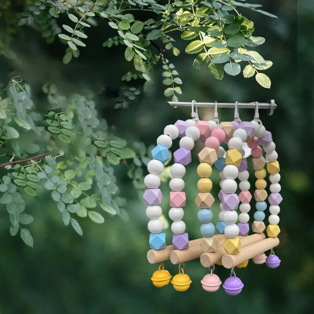 Juego de juguetes para pájaros para mascotas: columpio de campana de color macarrón + percha de madera maciza, juguete interactivo para masticar para periquitos, periquitos,