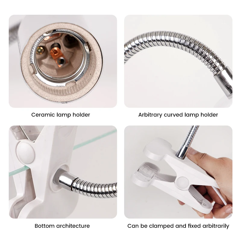 Soporte de luz con clip de sujeción fuerte y tubo flexible se puede ajustar libremente, enfocar la luz y el calor al punto deseado.