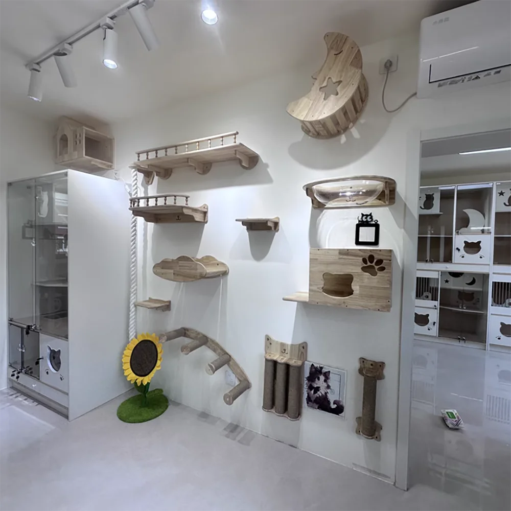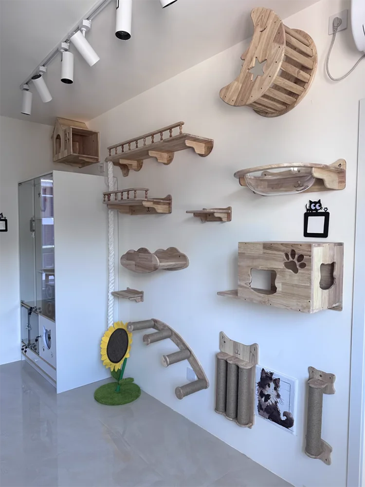 Nuestros productos se pueden combinar e instalar libremente según el espacio de la pared y las preferencias personales, incluidas cómodas hamacas para gatos, postes rascadores compactos para gatos, prácticas escaleras para gatos y prácticas plataformas de salto para gatos.Los gatos pueden tomar una siesta perezosa en las hamacas y disfrutar de un tiempo cómodo;Muele sus patas libremente en el rascador para gatos para mantenerlas afiladas;Escalando alegremente a lo largo de la escalera para gatos, liberando el deseo de explorar;También puedes contemplar el 'territorio' en la plataforma de salto, satisfaciendo su curiosidad y sentido del territorio.