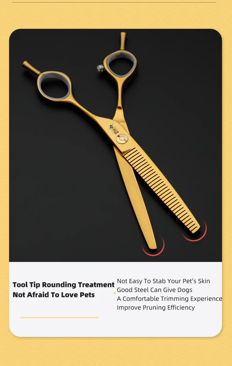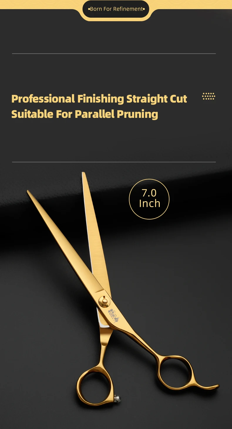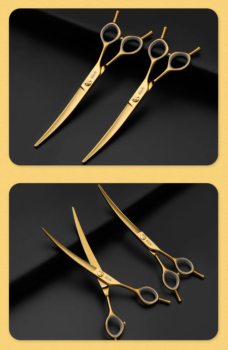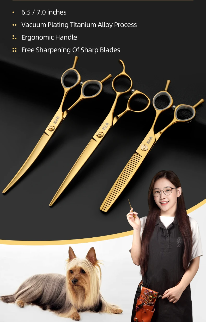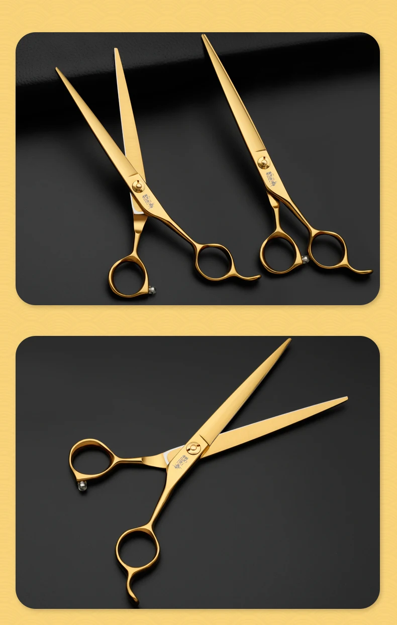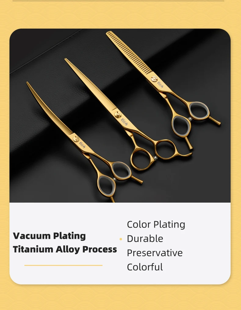 Juego de tijeras profesionales para el cuidado de mascotas, cortador de pelo curvo y liso de 7,0 pulgadas chapado al vacío en oro para el cuidado de la belleza