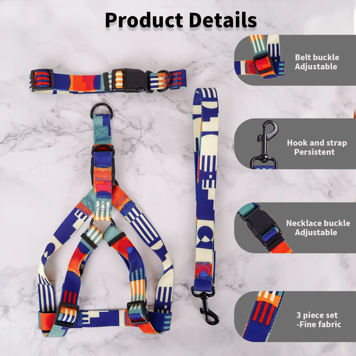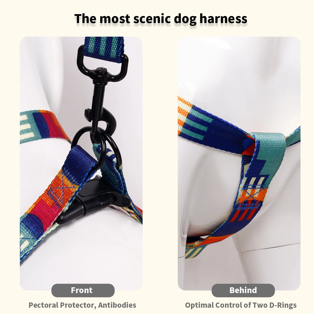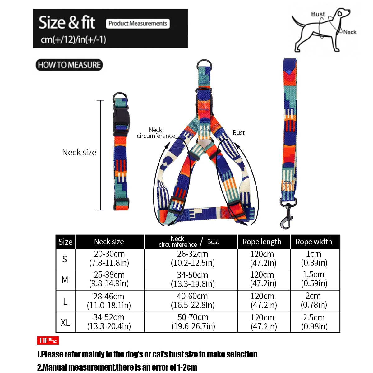 Cómodo y sin restricciones: el collar y el arnés para perros adoptan un sistema de ajuste de tres puntos, que puede ajustar la longitud, de modo que el arnés y el collar se ajusten mejor al cuerpo del perro, eliminan la presión de tracción sobre el cuello de la mascota y hacen que su perro sea más cómodo al caminar o entrenar.Adecuado para todas las estaciones, ya sea para salir a caminar, viajar o mantener a su mascota de buen humor.