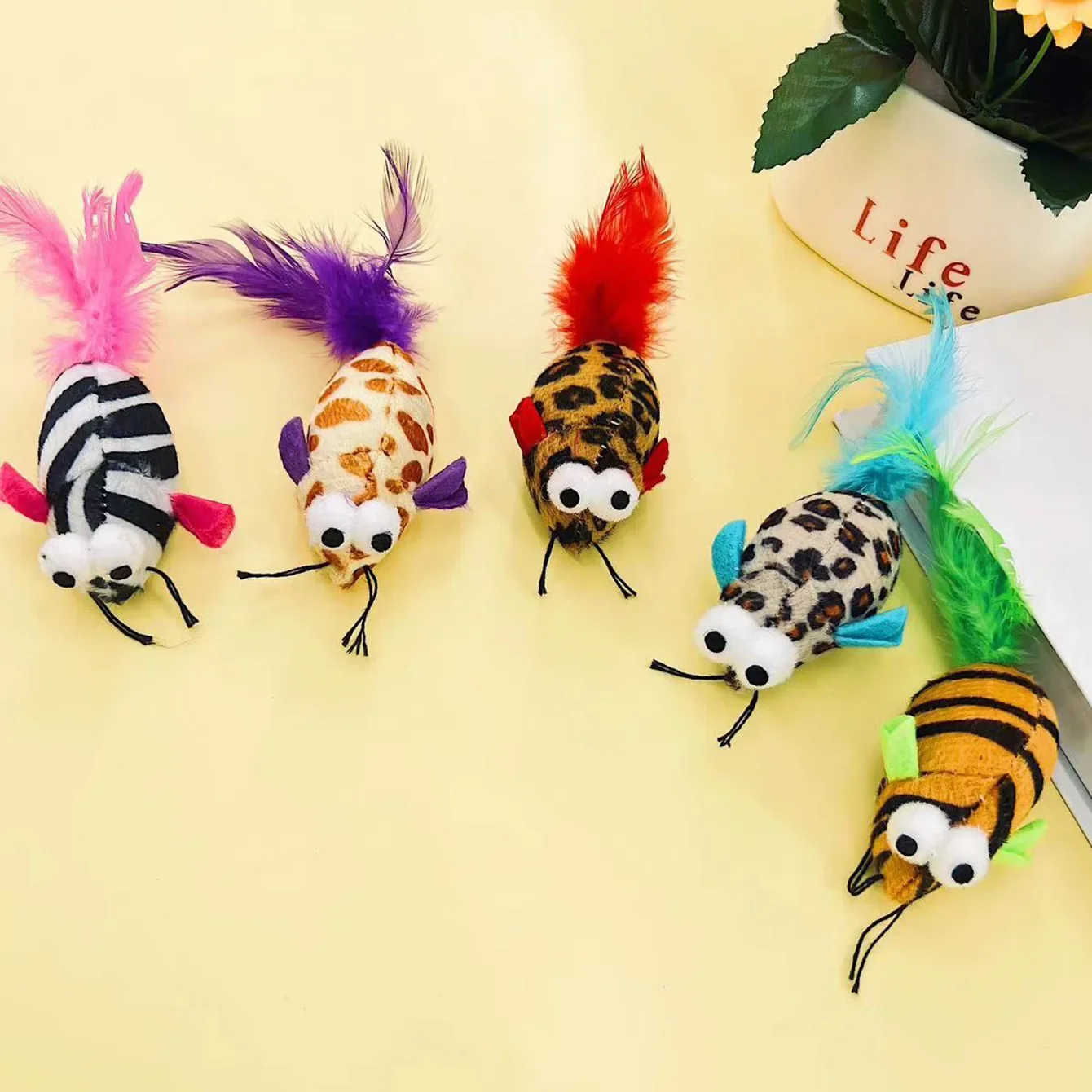 Juguete de cola de plumas a rayas de colores simulados con ojos grandes, ratones que contienen hierba gatera, ratones de peluche, juguetes interactivos para gatos