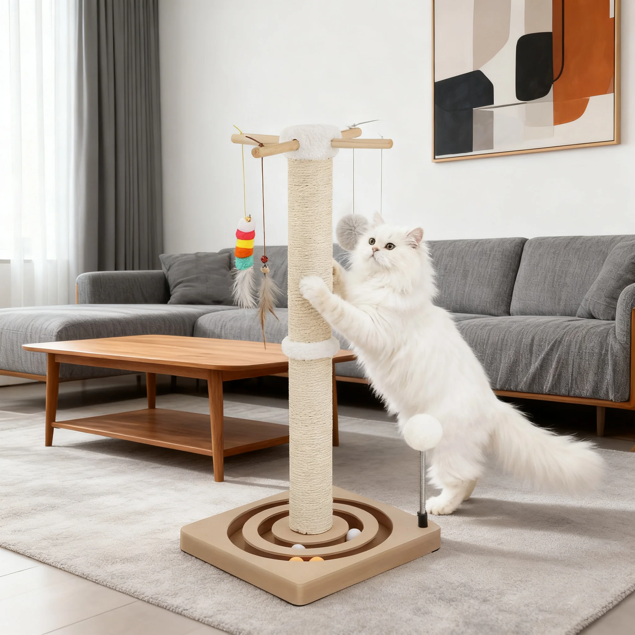 Torre de juguete de madera para gatos, divertido palo de gato, bolas de Sisal, cáñamo, gatito, tabla para rascar con plato giratorio, accesorios de bolas interactivas