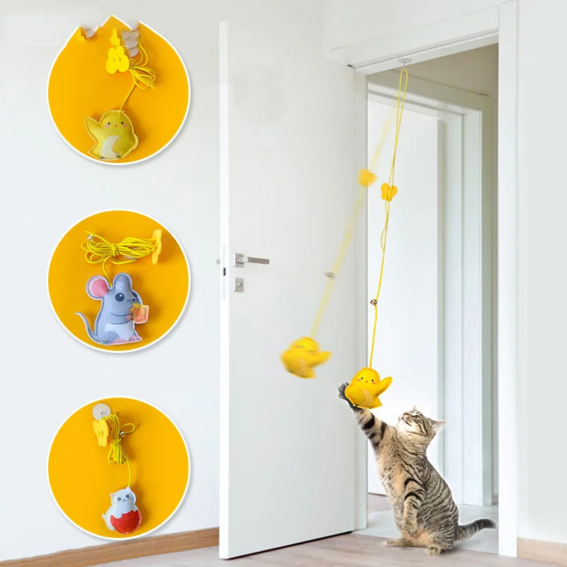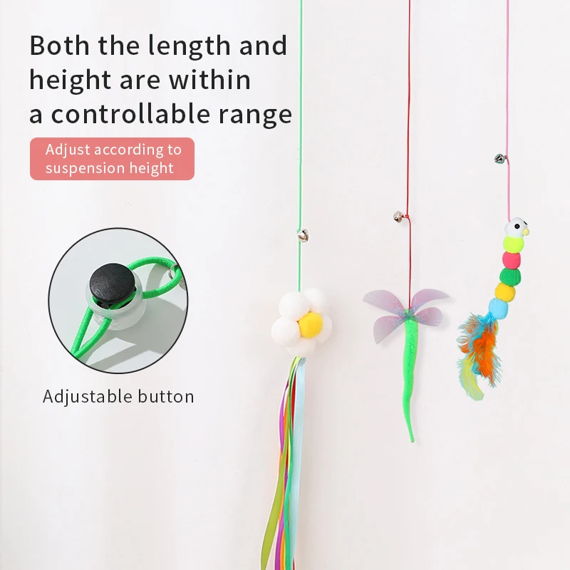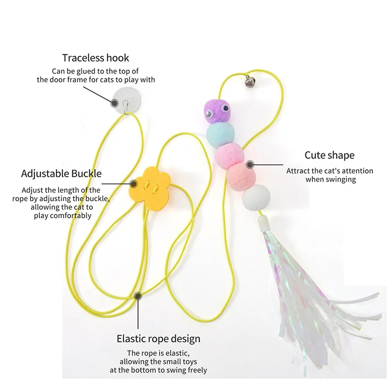 2.Diseño: juguete para gatos oscilante, este juguete para gatos se puede colgar en la parte superior del marco de la puerta con un gancho adhesivo que no deja marcas, ajusta la longitud de la cuerda ajustando la hebilla, deja que el gato juegue solo, la cuerda es elástica, el bádminton oscilante atrae la atención del gato. Hay una pequeña campana en la cuerda, que suena de un vistazo, lo que atrae al propietario a interactuar con el gato.