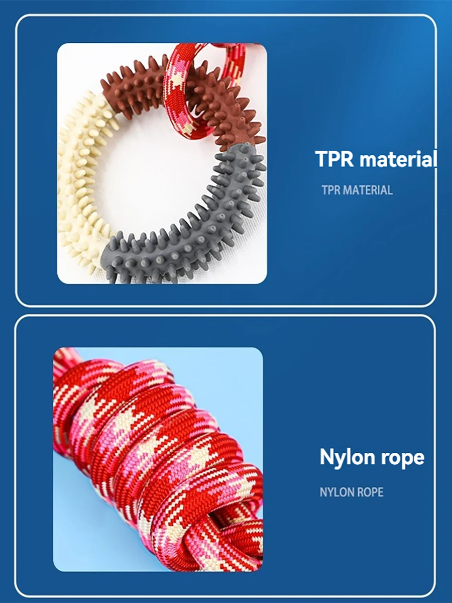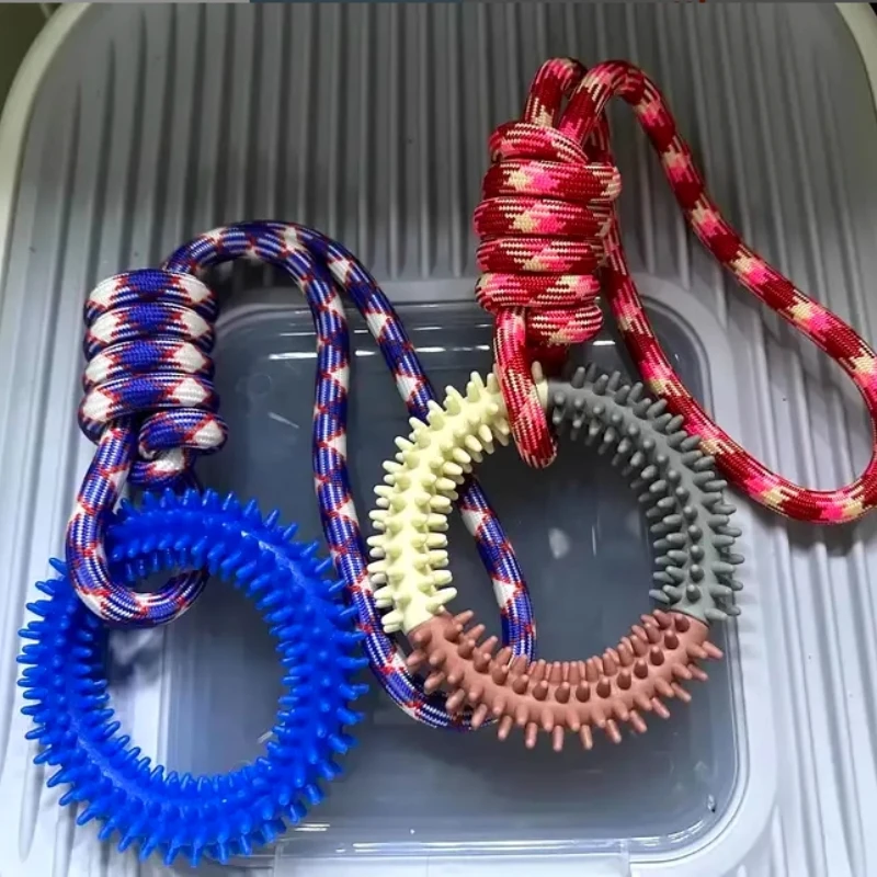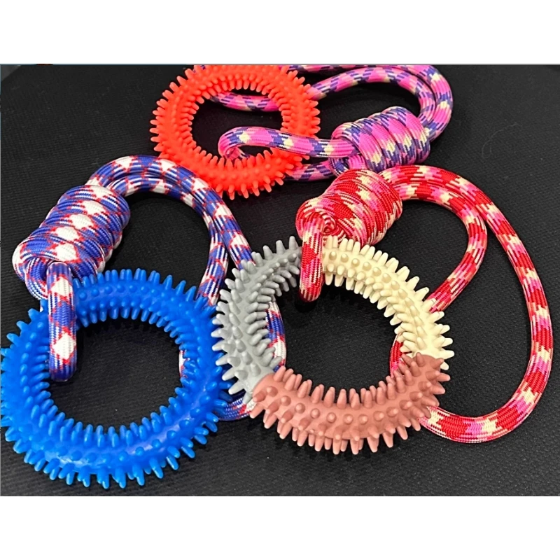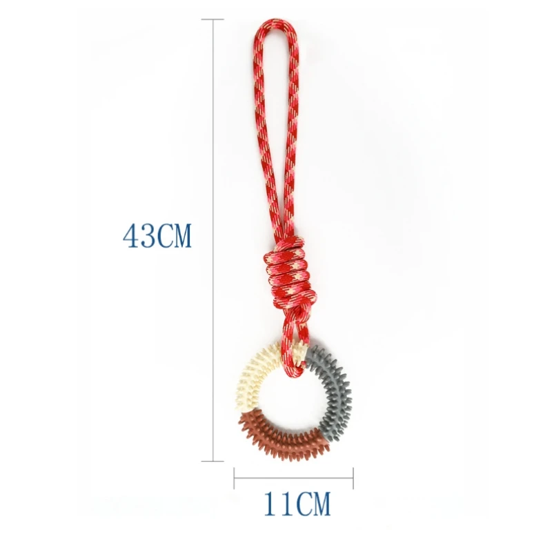 Juguete interactivo para perros con anillo con púas, anillo de limpieza de dientes resistente a masticar, juguete de entretenimiento con nudo trenzado colorido para diversión al aire libre