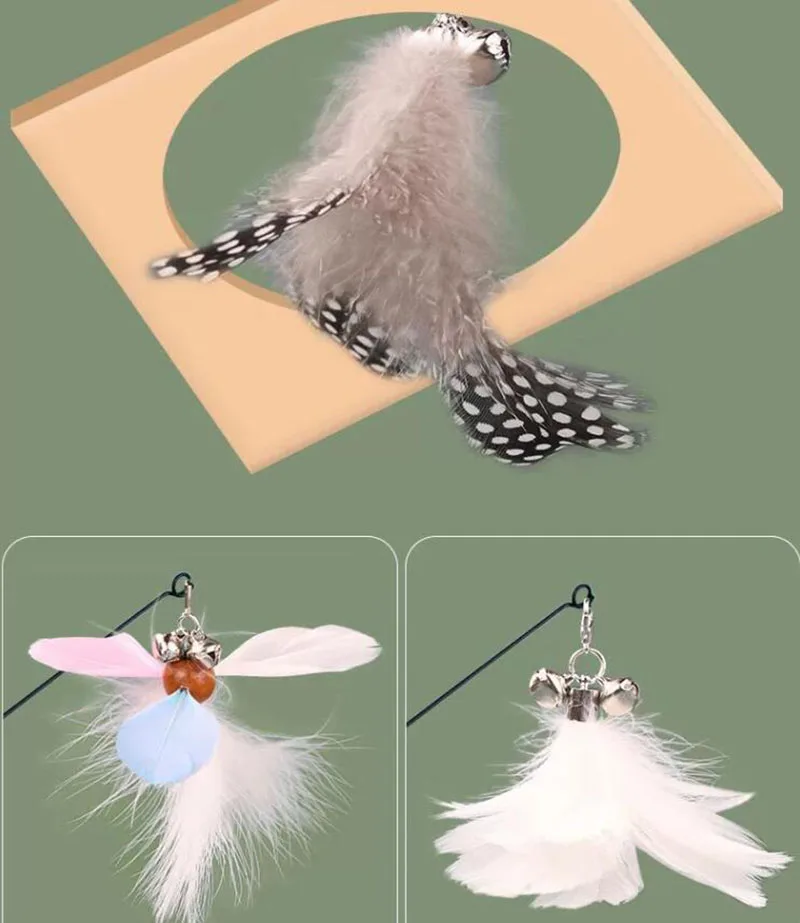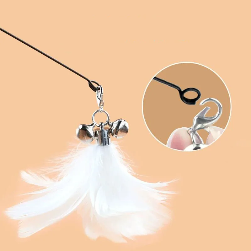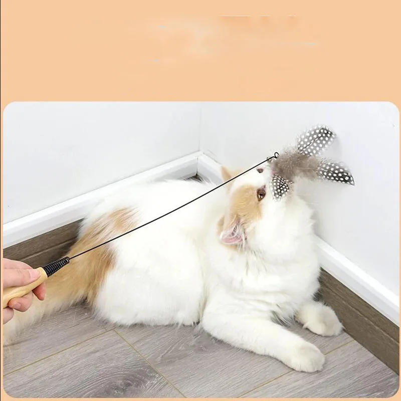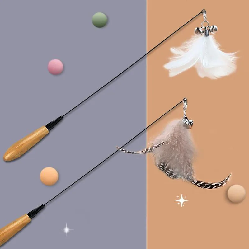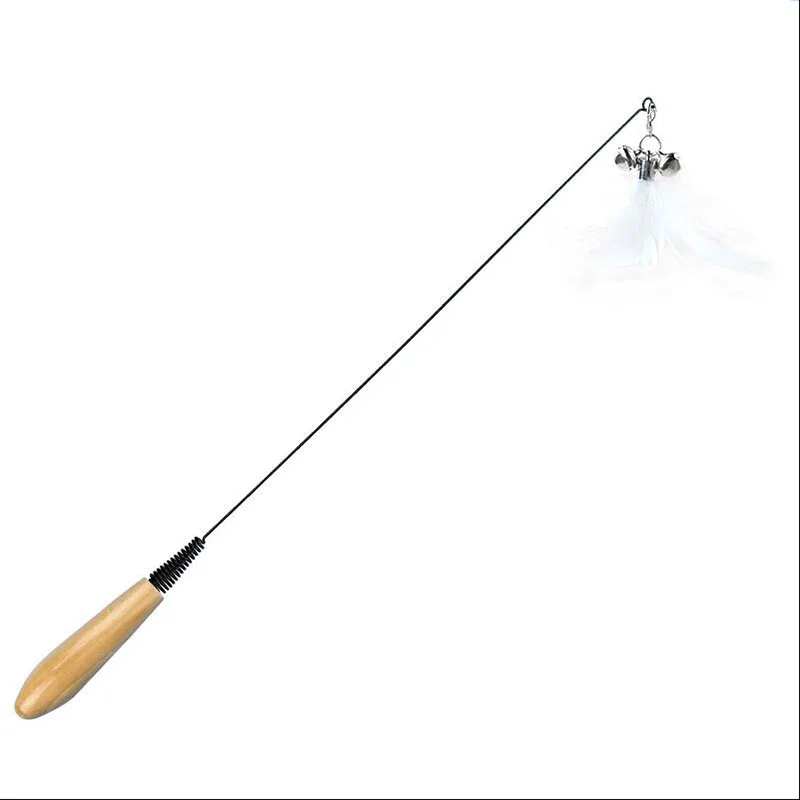 Juguete para mascotas con mango de madera, palo de gato divertido de primavera, campana de cinturón de plumas, pluma reemplazable