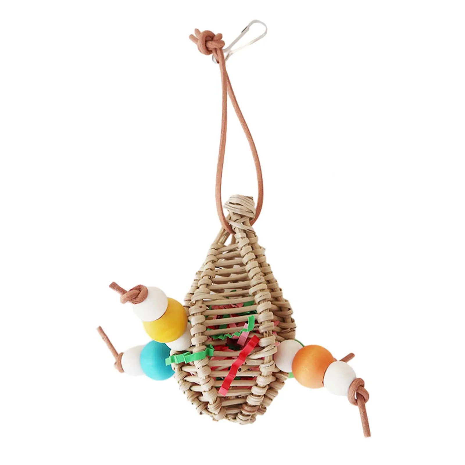 【Material】Este juguete para loros está hecho de excelente madera, ratán, cuerda de cuero y papel de seda, que son fuertes y duraderos.