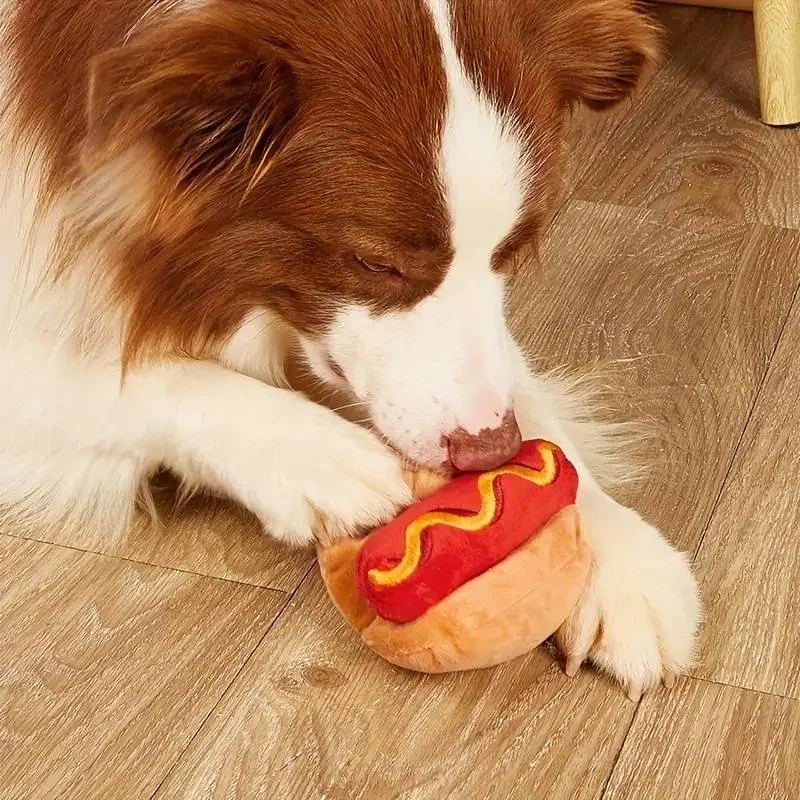 Juguete de peluche chirriante con dientes para moler mascotas, diseño de perro caliente, juguete para masticar duradero para suministro interactivo para perros, 1 ud.