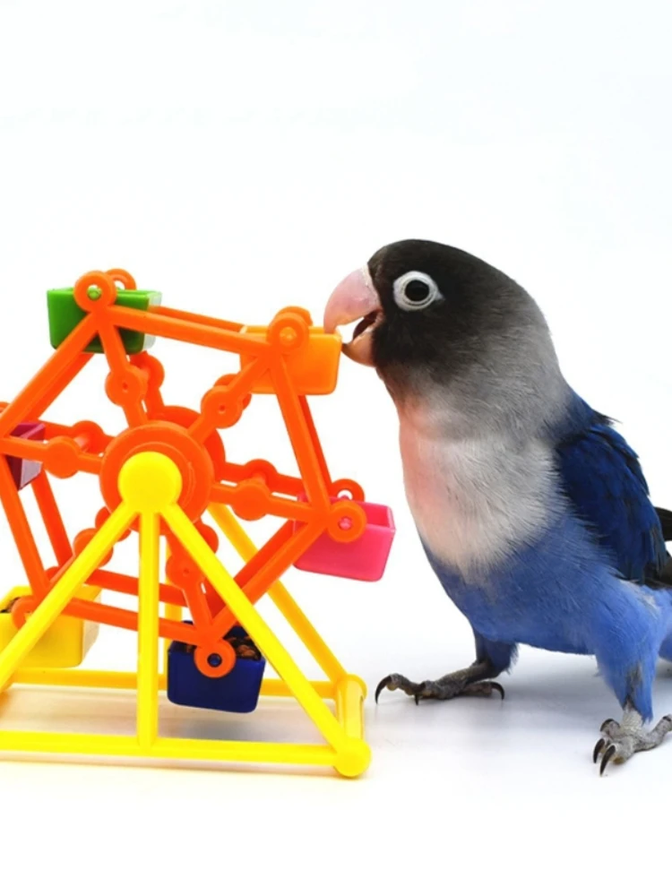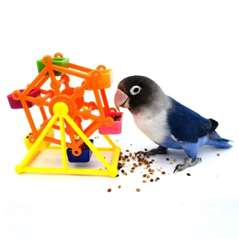 Juguete de jaula: Puedes colocar el juguete para pájaros en cualquier lugar de la jaula para atraer a los pájaros.Es fácil de limpiar y se puede utilizar repetidamente.Llenamos la comida hasta el molino de viento, empezando a ejercitar la inteligencia de tu loro ahora.