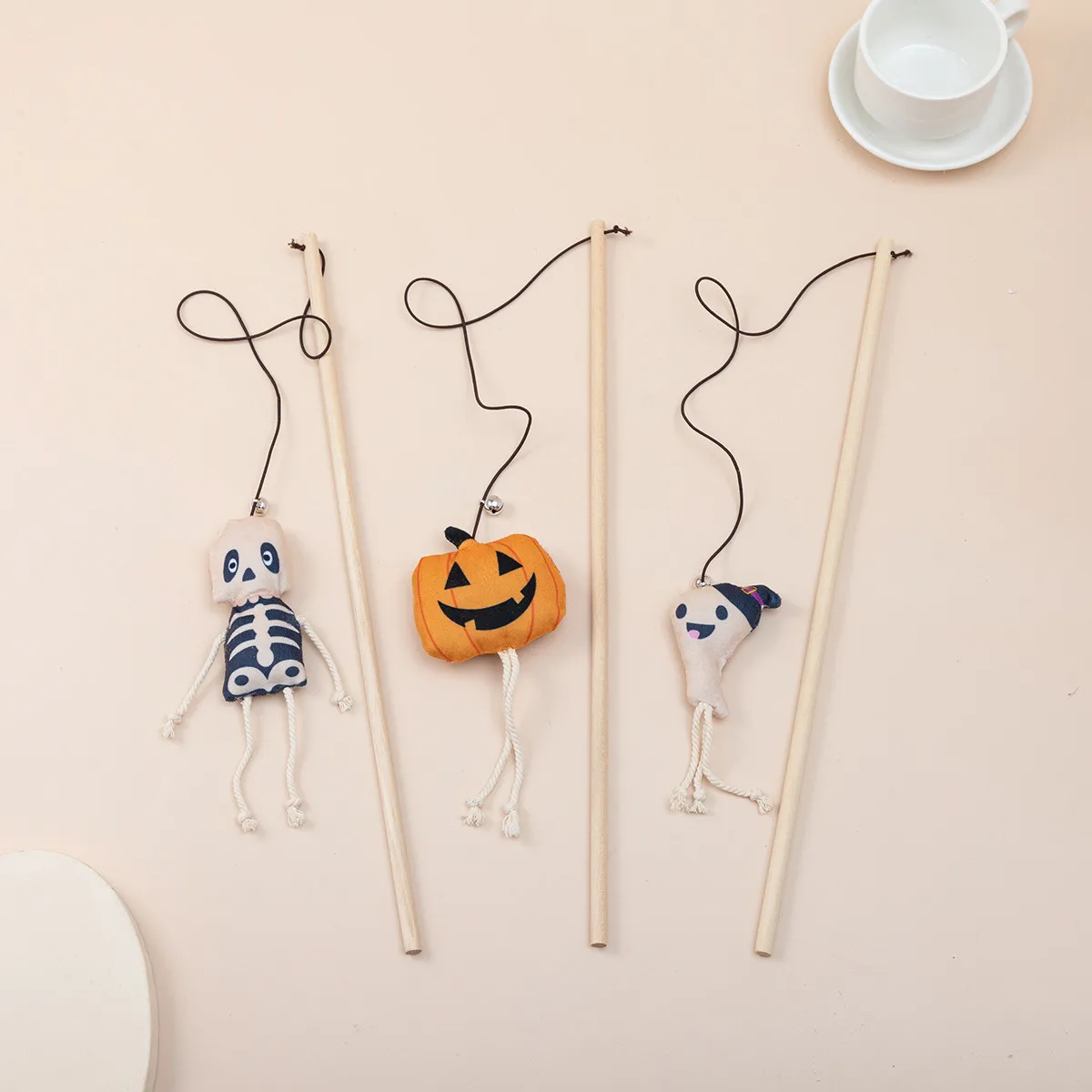 Juguetes interactivos para gatos, cuerda de algodón con campana, Varita Teaser, suministros para gatitos, esqueleto divertido, fantasma, halloween