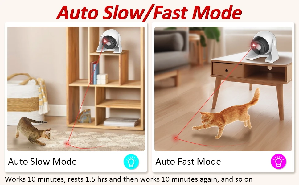Modo automático de velocidad lenta/rápida: en estos 2 modos de juguete interactivo automático para gatos ATUBAN, funciona 10 minutos después del tiempo de espera de entrada, 1,5 horas más tarde vuelve a funcionar 10 minutos, y así sucesivamente. Puede elegir la velocidad según la personalidad de sus gatos. Las mascotas descansarán después de hacer 10 minutos de ejercicio.