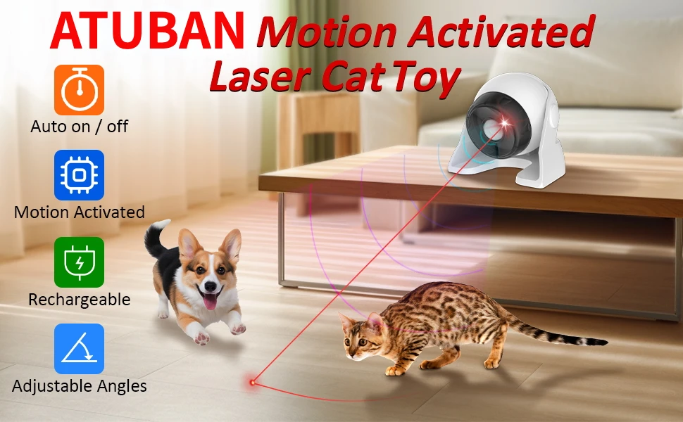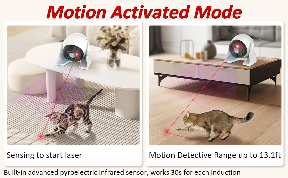 Modo interactivo activado por movimiento-ATUBAN juguete láser para gatos activado por movimiento sensor infrarrojo piroeléctrico avanzado incorporado activa el juguete láser de forma inteligente y se activa automáticamente y funciona 30s cuando detecta un gato/perro/mascota en movimiento/gatito. Sus mascotas pueden jugar con él todo el tiempo que quieran hasta que la batería se agote.