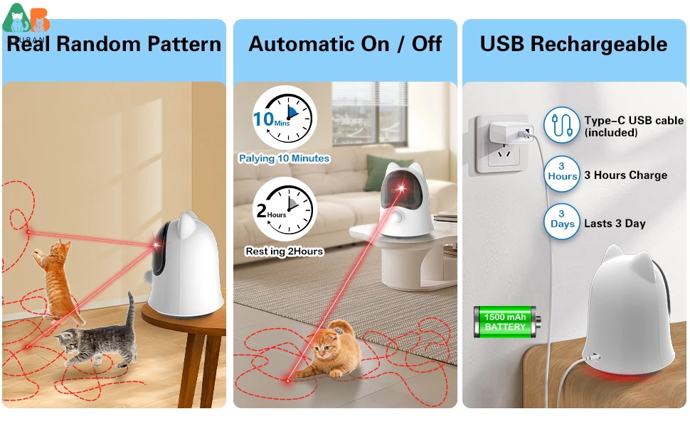 Como juguete láser automático para gatos con patrones aleatorios, será un fiel compañero de juegos de tus gatitos, gatos y perros.