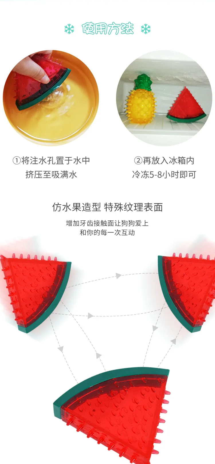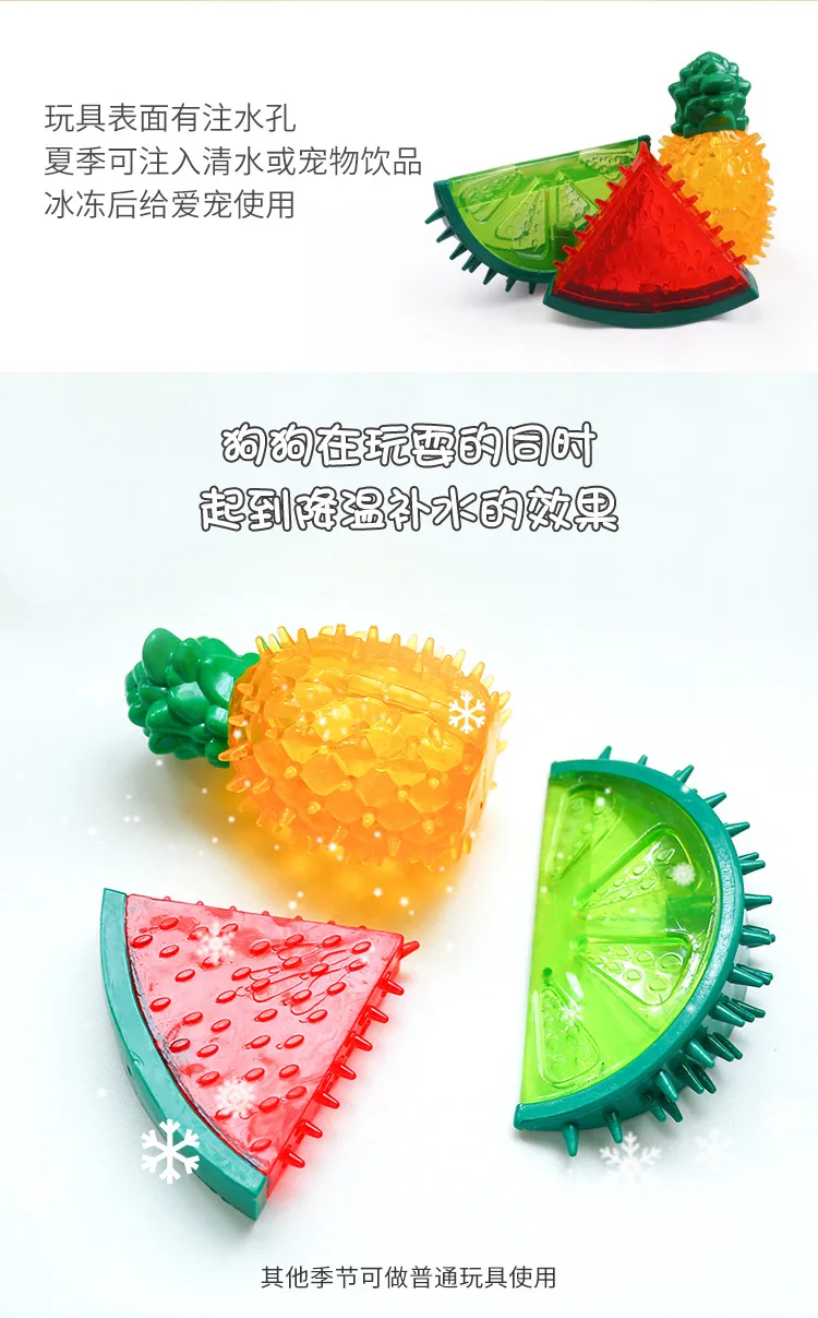2. Juguete de diente congelado: está lleno de agua 100% pura y se puede congelar en el refrigerador para enfriar al perro sobrecalentado en el verano caluroso. Nota: el orificio de inyección de agua debe estar hacia arriba para evitar que el agua se desborde. No deje que su perro juegue con juguetes descongelados, para no dañarlos.