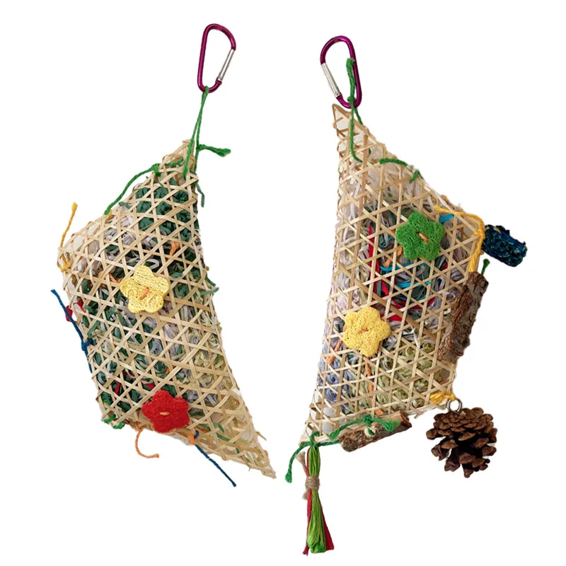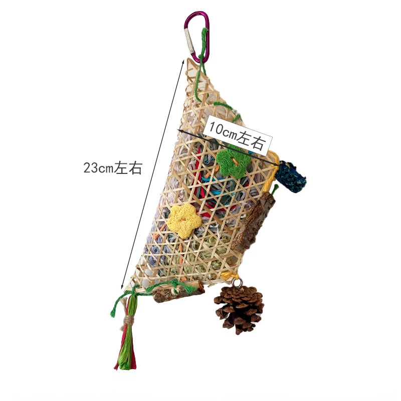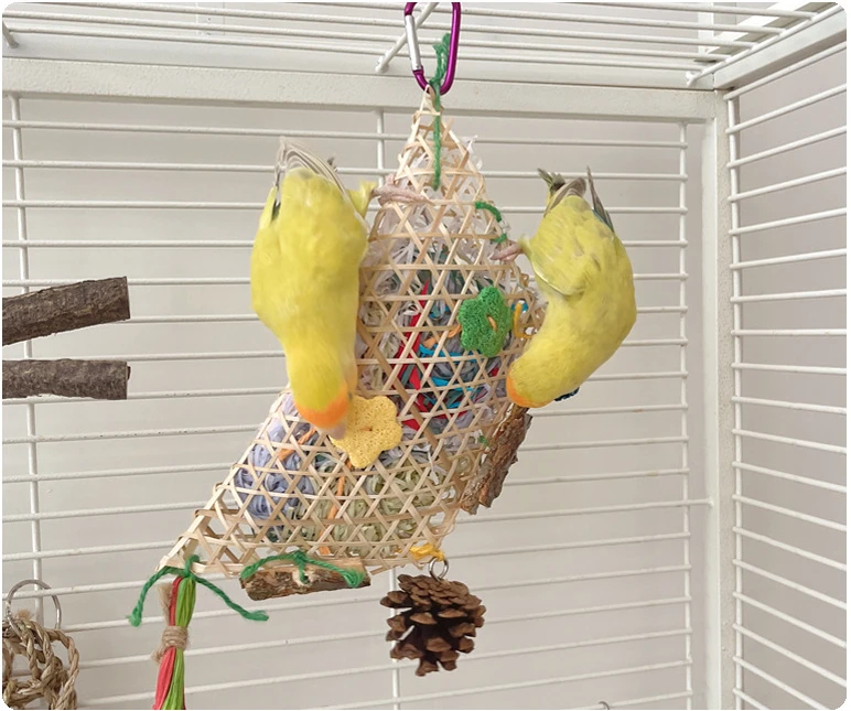 Masticación segura: los juguetes de alimentación de aves tienen un marco de bambú con papel triturado comestible de colores, piezas de madera natural y una cuerda de algodón suave y gruesa para que las aves mastiquen. Nota: cuando se haya consumido el papel triturado, puede cortar 2 lazos y rellenar un nuevo paquete de papel triturado.