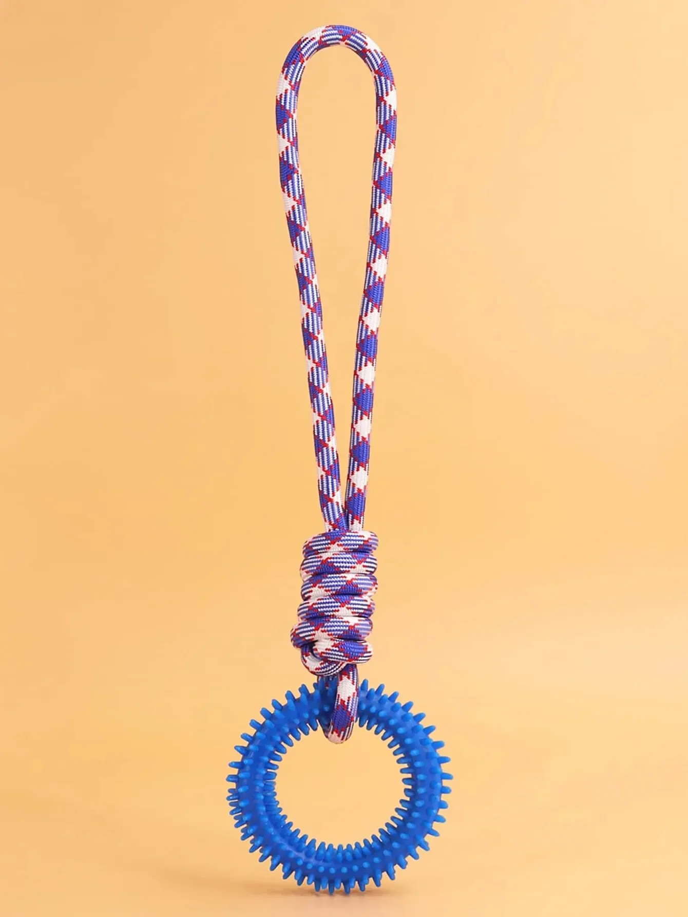 El juguete en forma de anillo cuenta con púas que ayudan a limpiar los dientes de su perro, promoviendo la higiene bucal mientras juega.