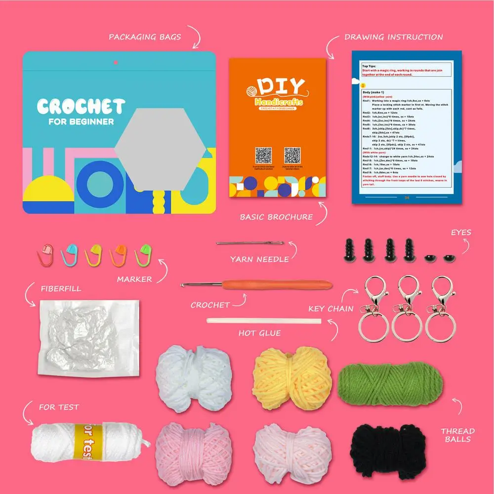 Bienvenido al mundo del ganchillo con nuestro relajante y educativo Kit de peluche. Con hilo de algodón de leche tejido fácil, haz que el ganchillo vaya sin problemas. Nuestro kit incluye todo lo que necesitas para crear tres lindas criaturas de llavero. ¡Disfruta del proceso y muestra tu talento con orgullo!