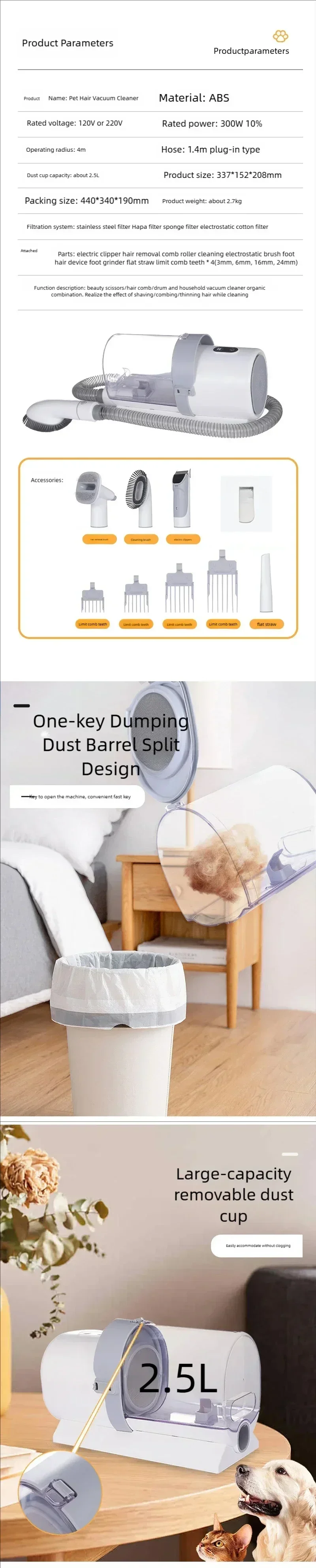 Say farewell to the living environment full of hair easily - the grooming-suction integrated design and 10kpa suction power allow you to clean up most of the hair while combing it. The 2.5L easy-to-detachable dust cup can meet your multiple uses without frequent cleaning, All of that gives you a more suitable living environment for babies and adults