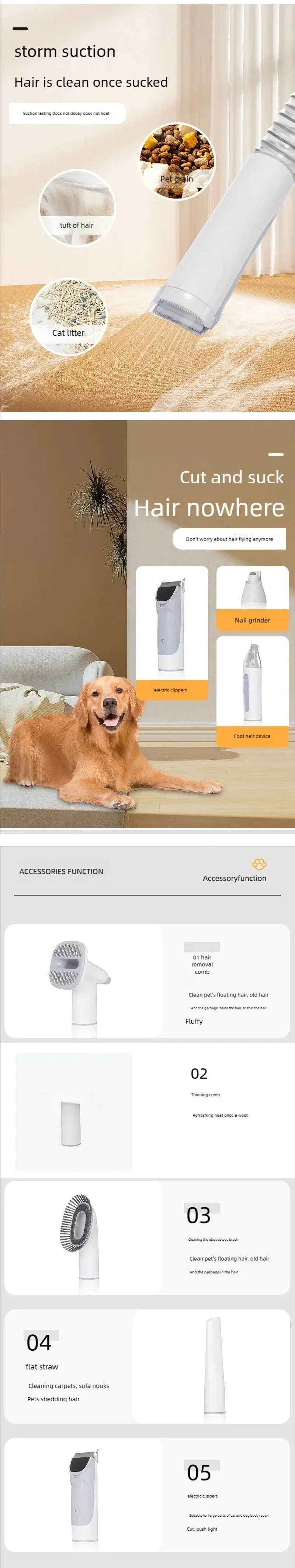 Grooming pets at home - This pet grooming vacuum kit contains 4*Clipping Comb, 1*Grooming Brush, 1*Deshedding Tool, 1*Electric Clipper, 1*Nozzle, 1*Cleaning Brush, which can meet your needs for grooming, trimming and grinding nails for pets, and subsequent hair cleaning, so that you can complete cleaning and grooming for pets without leaving home, which can saving time, effort and money
