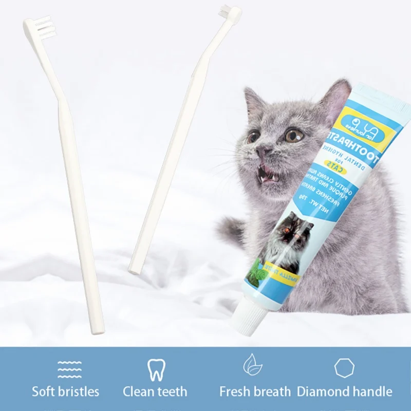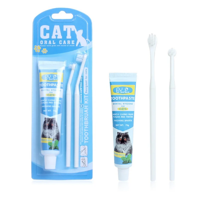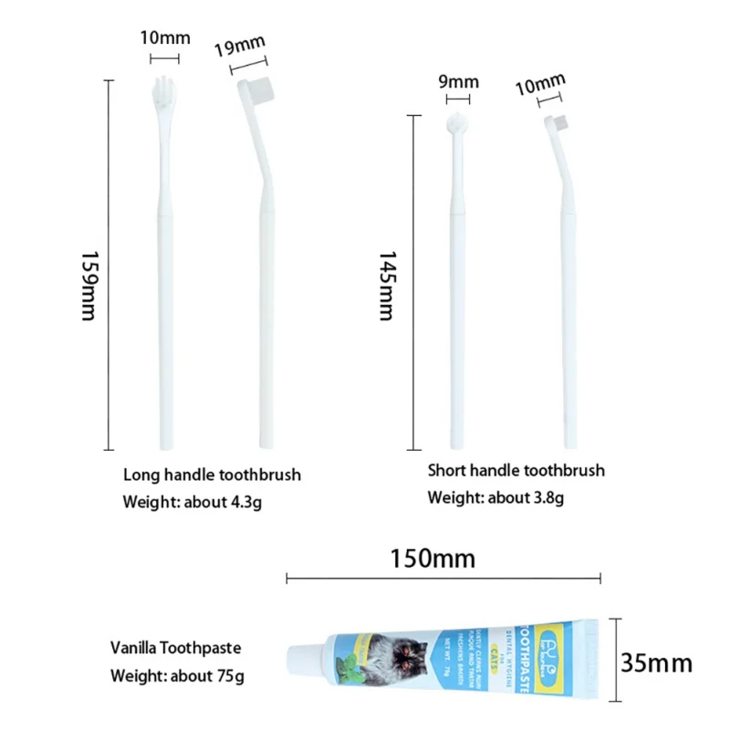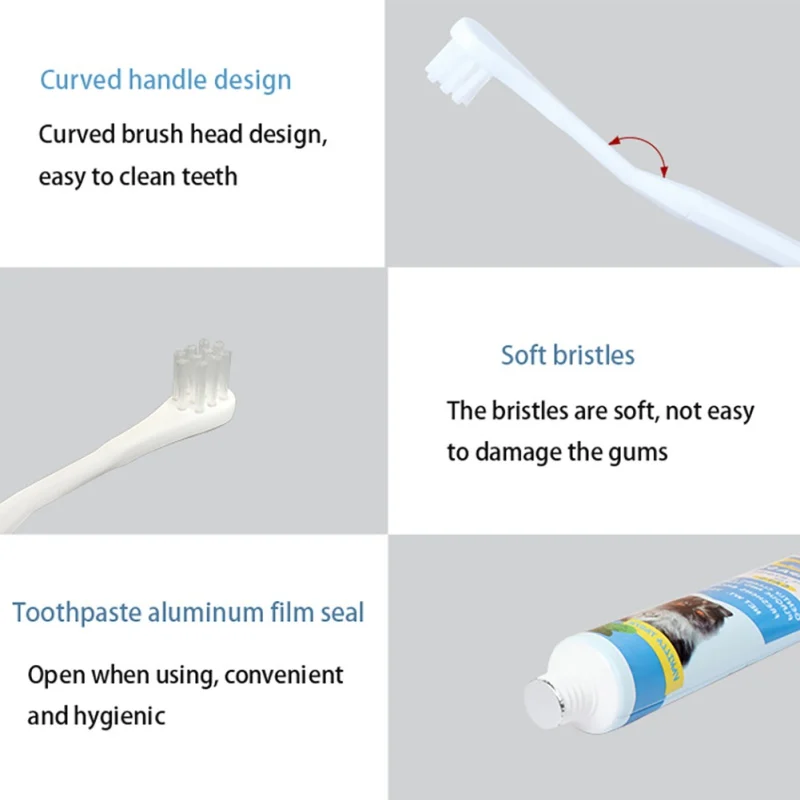 1. Este es un juego de pasta de dientes para mascotas, que incluye un cepillo de dientes de dos extremos y una pasta de dientes.