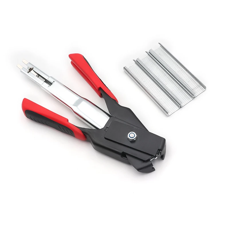 Coloca el clavo en la ranura y utiliza el alicate para fijar el anillo C; repite para las uniones necesarias. El diseño con acero inoxidable y TPR garantiza una sujeción estable incluso en exteriores. Recomendado para trabajos de cerco y jaulas de alambre.
