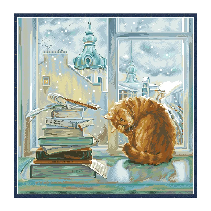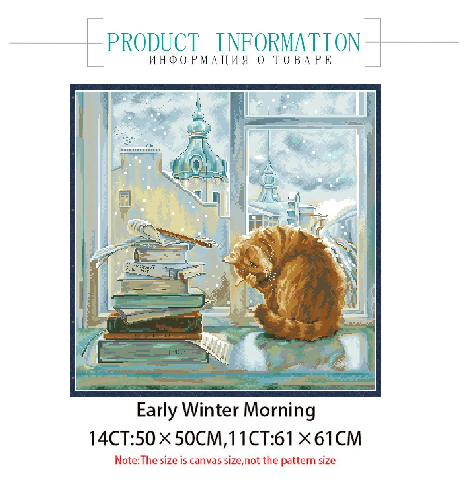 Kits de punto de cruz contados para la mañana de invierno temprano, patrones de gatos, paquete de bordado de lienzo sin imprimir, 11CT, 14CT, pintura de costura DIY
