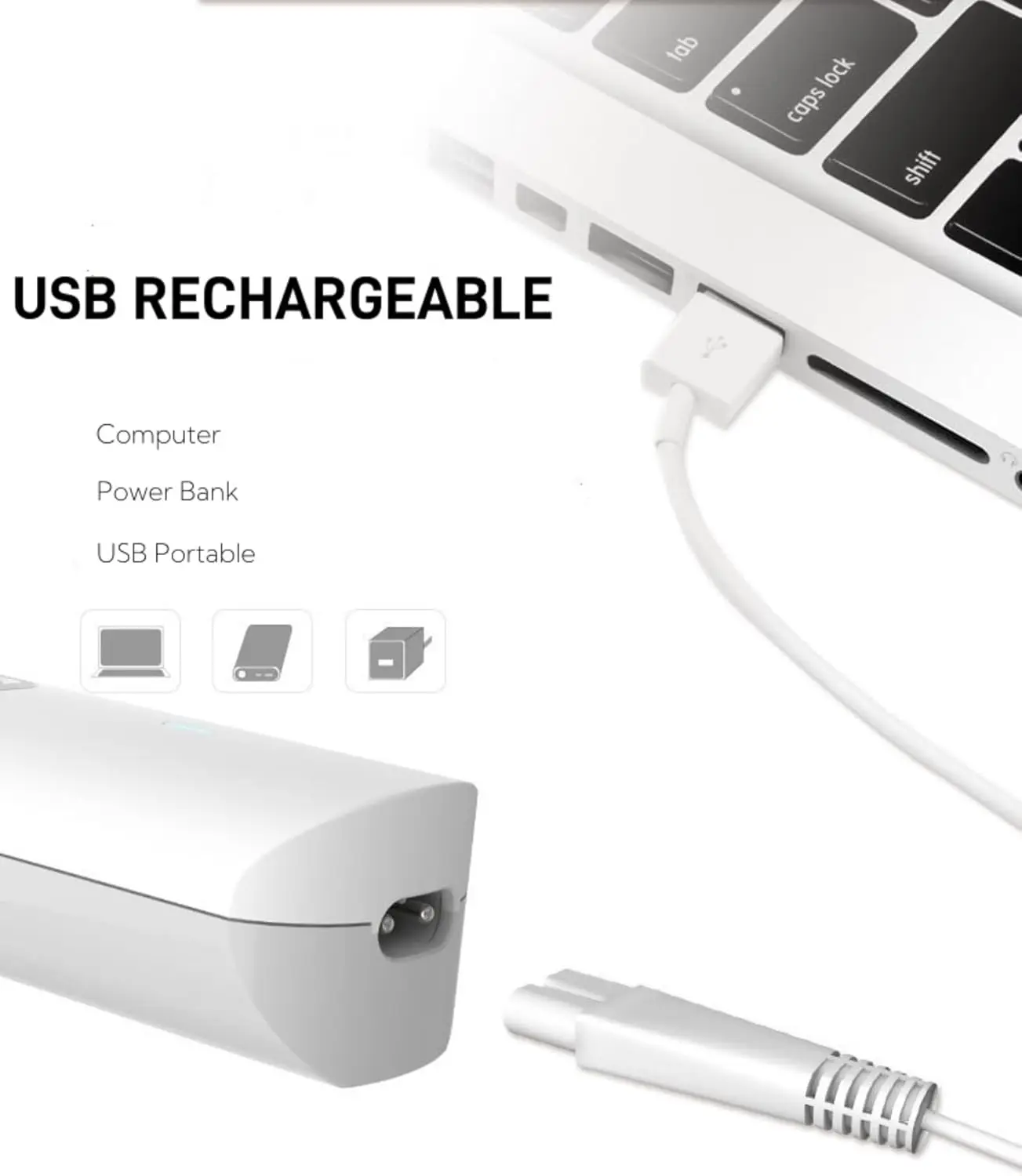 ● USB recargable▶El cortapelos multifuncional para mascotas podría usarse durante aproximadamente 2 horas después de cargarse completamente, puede cargarlo con un cable USB a través de la banda de alimentación o el disco en cualquier momento.